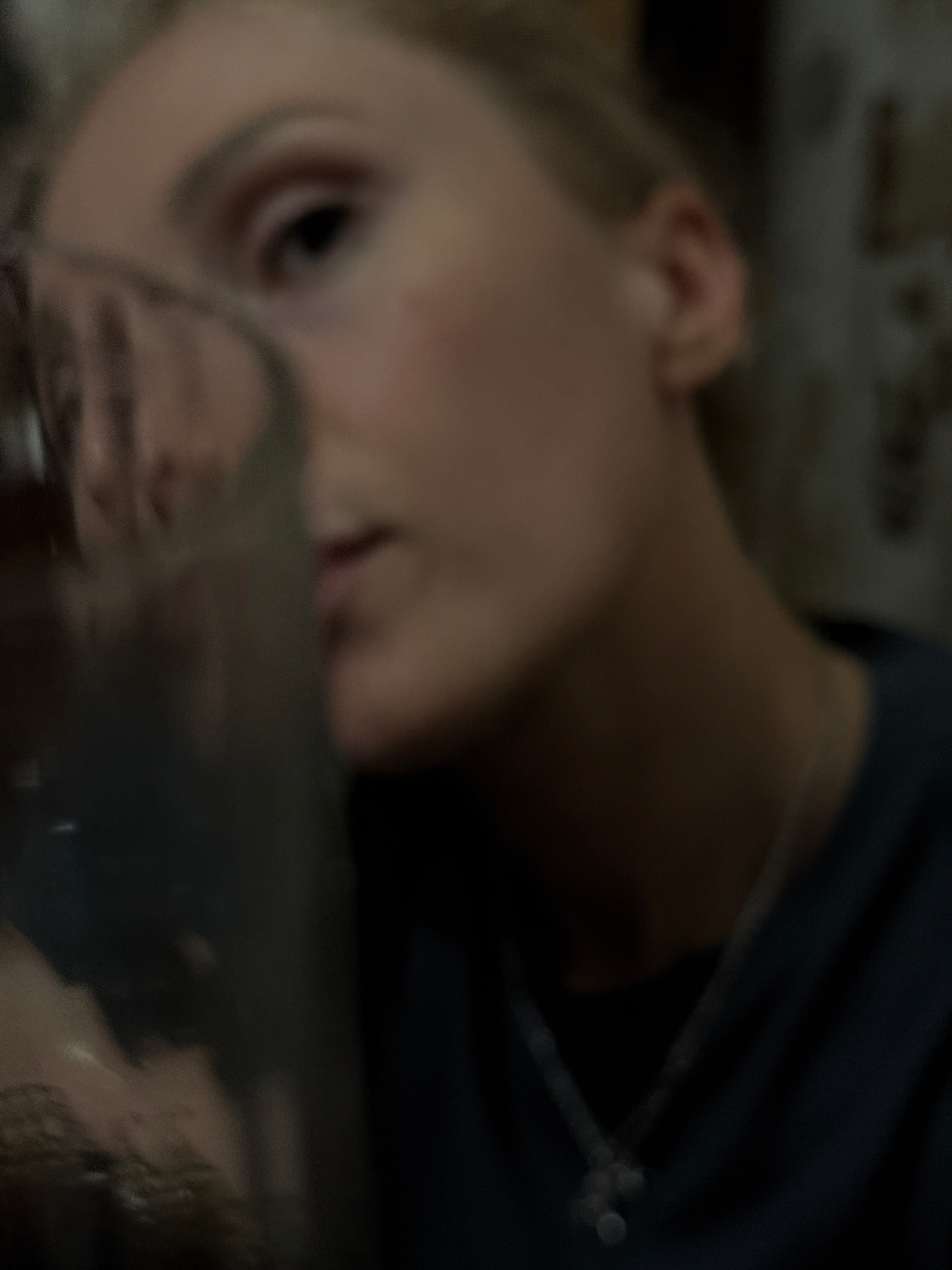 The image depicts a close-up view of a person lying on a surface, seemingly indoors. The person is fair-skinned, with blonde hair and appears to be wearing a necklace. The focus is soft, obscuring det…read more