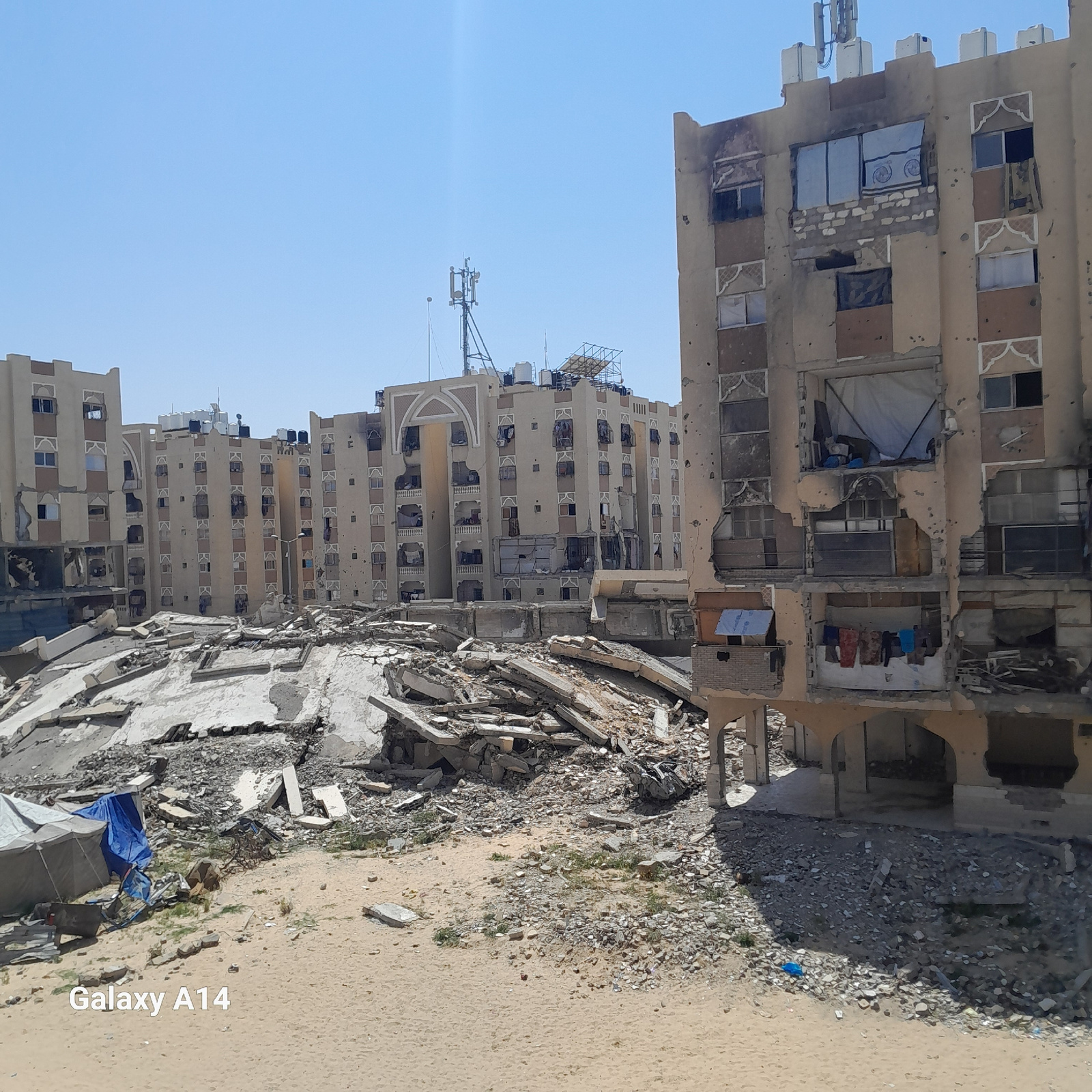 The image shows extensive destruction in what appears to be a residential area in Khan Yunis, Palestinian Territory. Several multi-story buildings are heavily damaged, with visible structural damage,…read more