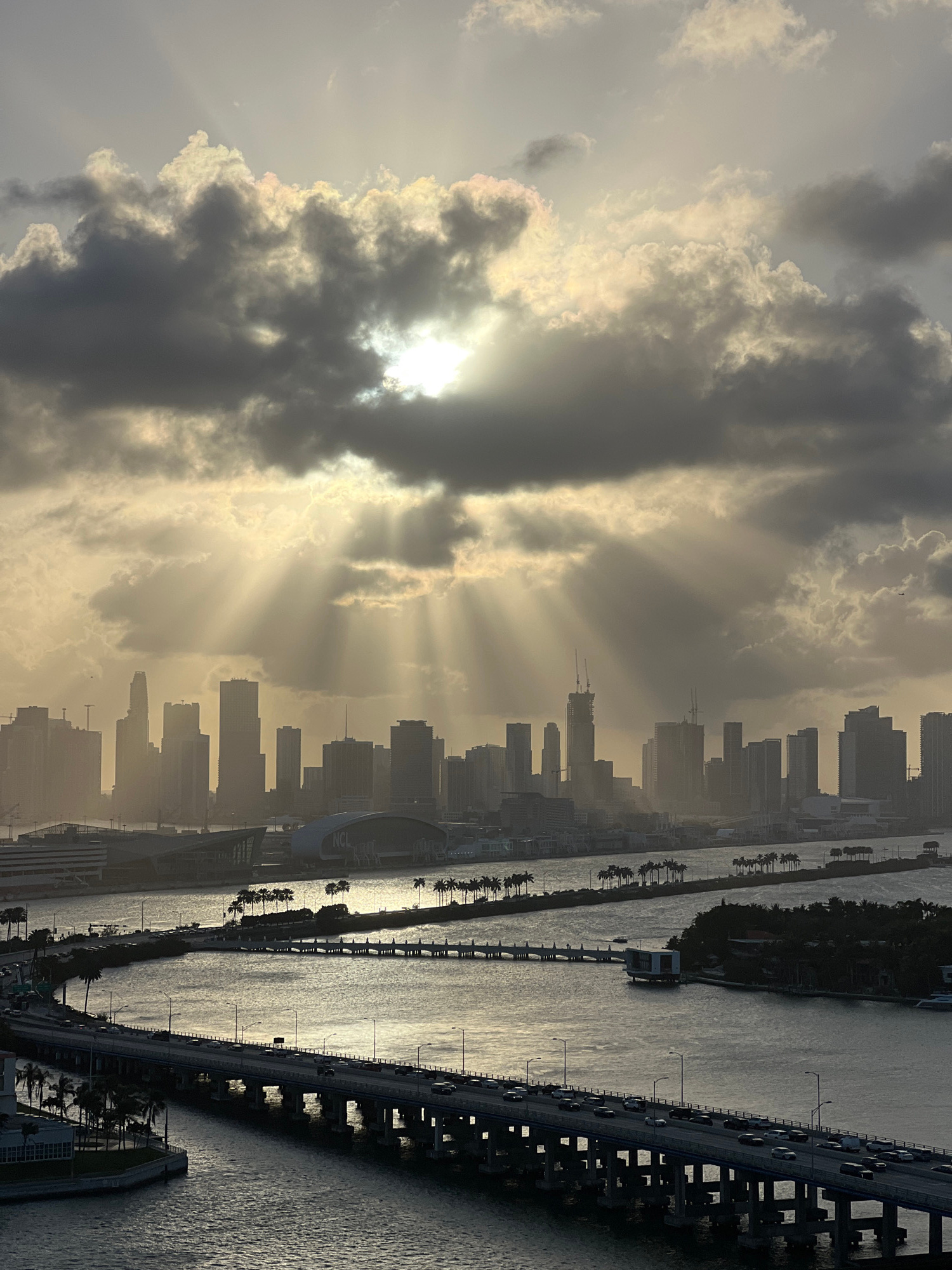 The image captures a sunrise over Miami Beach, Florida, United States. A dramatic sky with heavy clouds obscures the sun, but its rays break through, casting light beams over the city skyline. Buildin…read more
