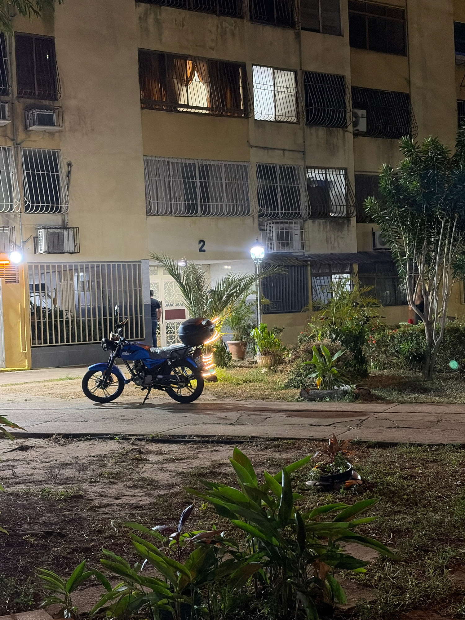 Captured at night in Ciudad Guayana, Venezuela, the image showcases a multi-story apartment building. A blue motorcycle parked in front of the building is a focal point. The building's facade exhibits…read more
