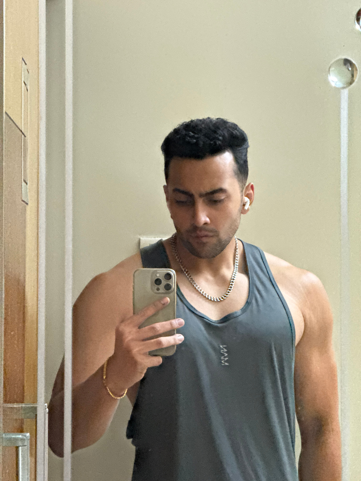A man wearing a grey tank top and gold jewelry, including a necklace and bracelet, is taking a selfie in a mirror. He is holding a phone with a gold-colored case. He has an earbud in his left ear. The…read more
