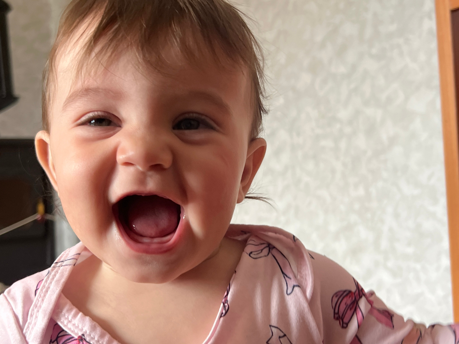 A baby is presented upside down, wearing a pink garment patterned with bows. The baby's mouth is open wide. The backdrop is a wall covered with a repeating pattern. The location is potentially Elena, Bulgaria, however no confirmatory evidence can be provided. | Open Wire
