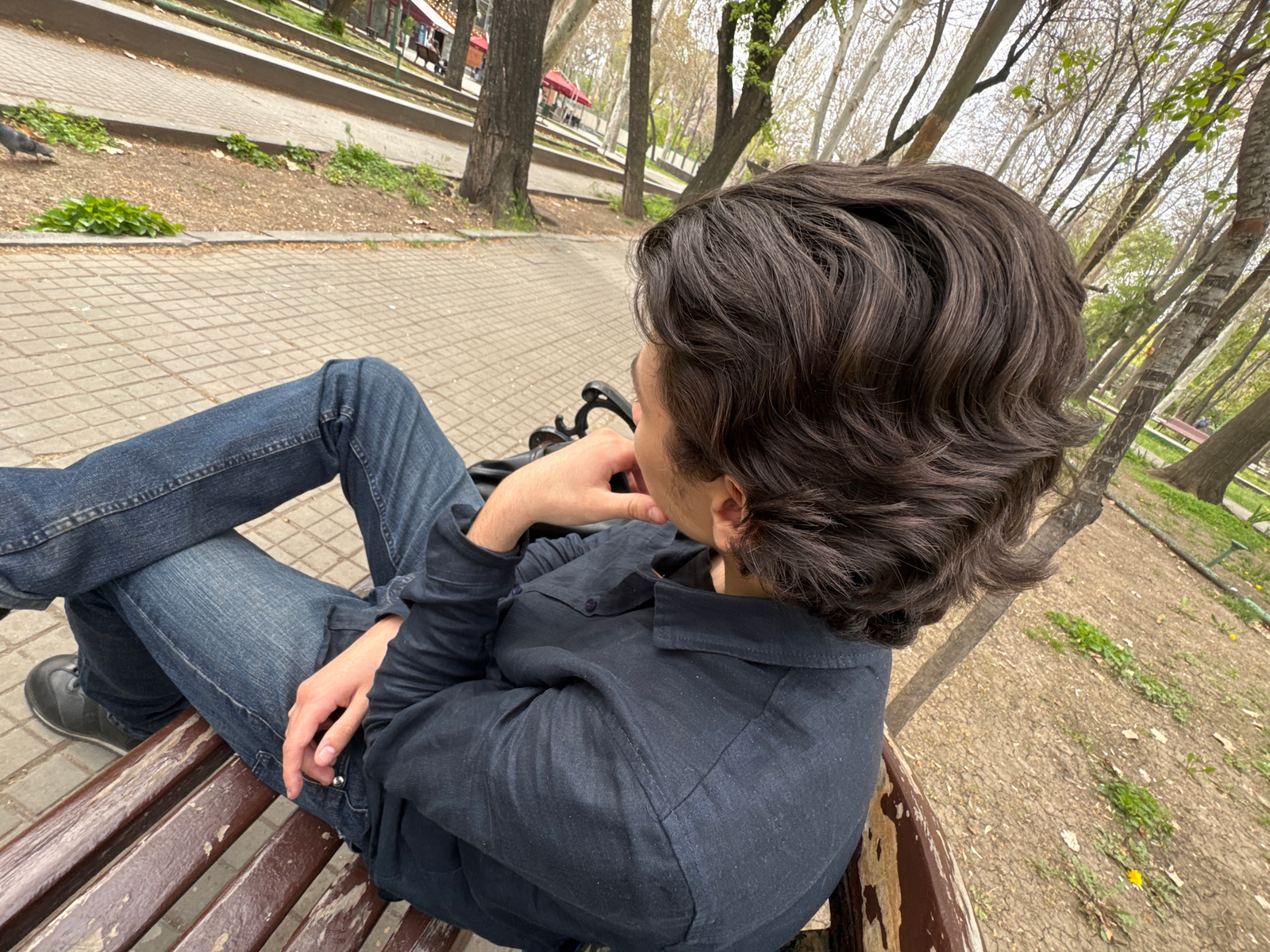 A young person with wavy brown hair is sitting on a brown wooden bench in a park. They are wearing a dark blue button-up shirt and blue jeans, with grey shoes visible on their right foot. The person i…read more