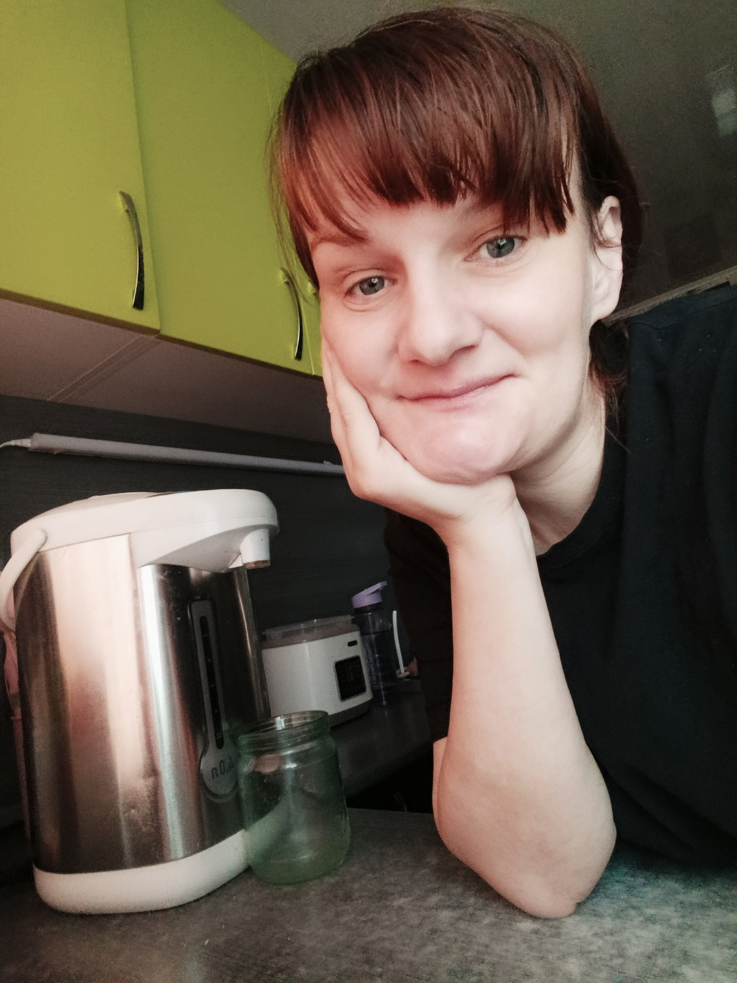 The image shows a person with short, reddish-brown hair and bangs, resting their face on their hand. They are wearing a black shirt. Behind them is a kitchen counter with a stainless steel water boile…read more