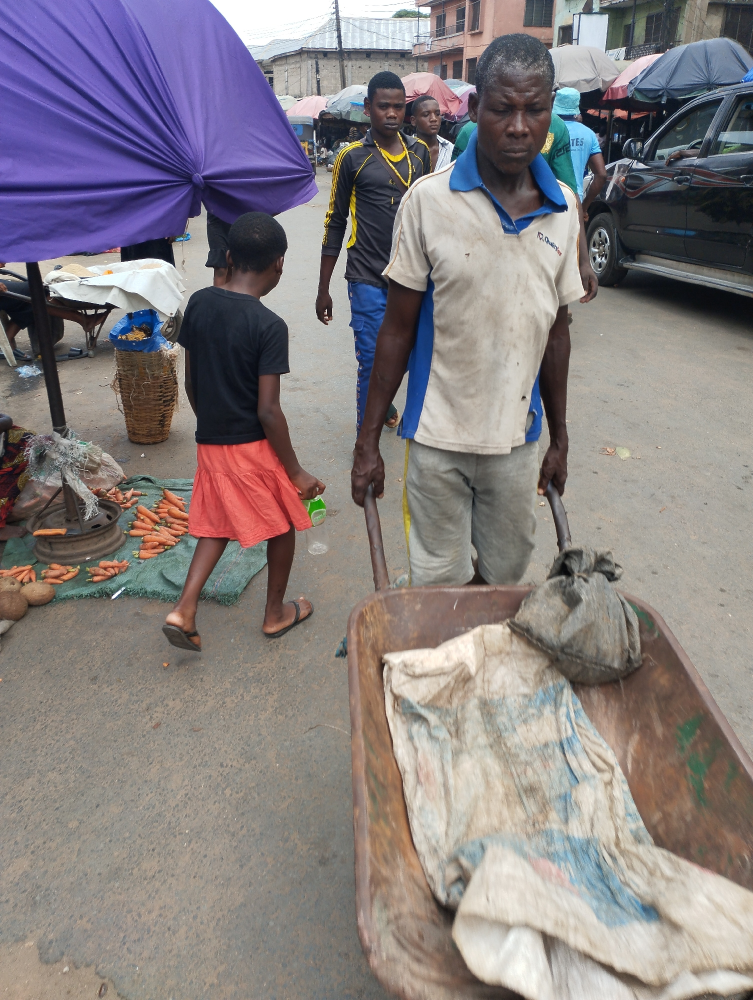 The image depicts a scene in Fegge, Nigeria. In the foreground, a man is pulling a wheelbarrow with what appears to be a white woven bag and a tied sack inside. He is wearing a soiled white and blue pβ¦read more