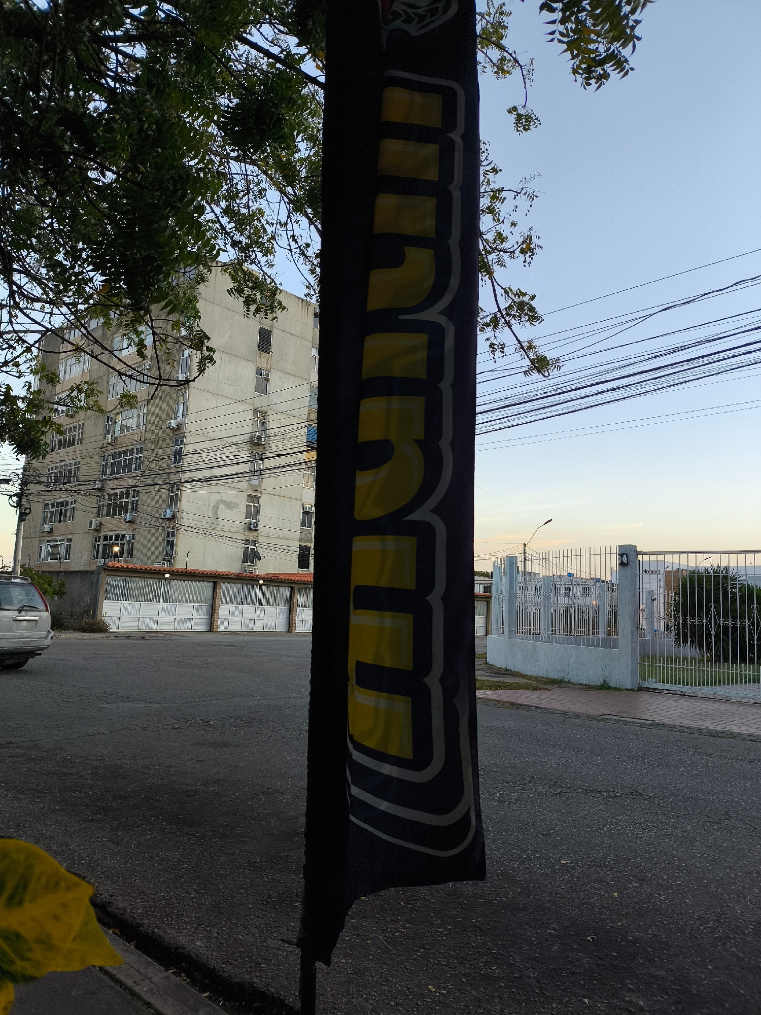 The image captures a street scene in Pampatar, Venezuela. The focal point is a vertical black banner with yellow lettering, partially obscuring the view. Behind the banner, a multi-story concrete building with numerous windows and air conditioning units is visible, along with a light-colored fence. A silver SUV is parked on the left side of the street. Power lines stretch across the sky. On the right, a white fence encloses a yard with vegetation. The street itself appears to be asphalt, and a curb with some vegetation is visible in the foreground. The sky is light blue, suggesting early morning or late afternoon lighting. | Open Wire