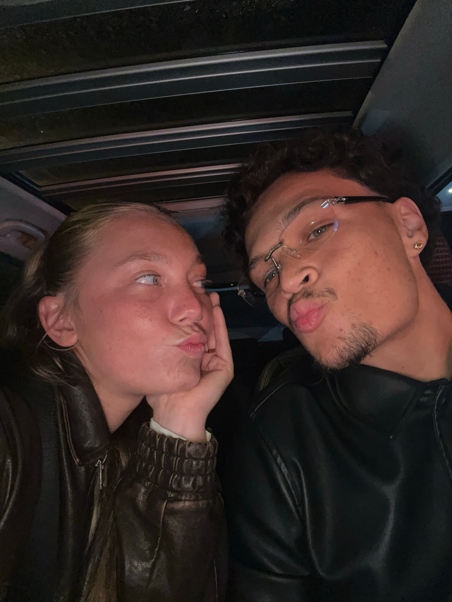 Two individuals are captured in an off-kilter selfie. The person on the left has fair skin, light blonde hair, and blue eyes. They are wearing a brown leather jacket and puckering their lips towards t…read more