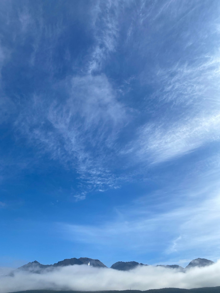 This image depicts a mountainous landscape in Ushuaia, Argentina, under a vast blue sky with scattered cirrus clouds. The upper two-thirds of the frame are dominated by a clear azure sky, transitionin…read more
