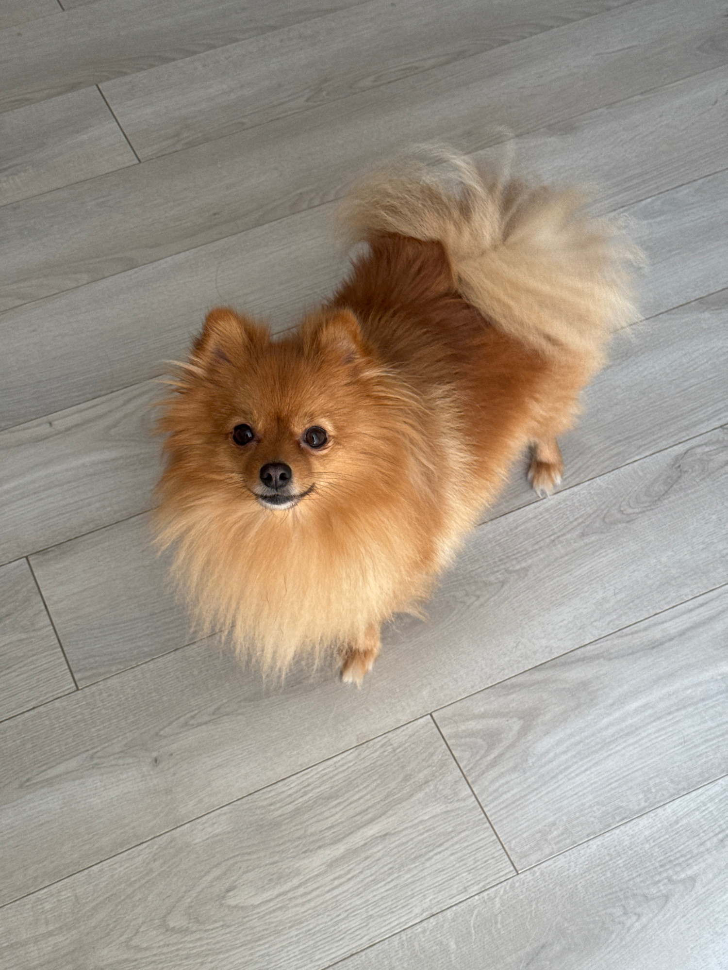 A single Pomeranian dog lies on a light grey laminate floor with a wood grain pattern. The dog is light brown with a thick coat of fur and a bushy tail. It appears to be lying down, with its front paw…read more