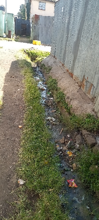 This image depicts a scene consistent with an informal settlement or slum environment within Nairobi, Kenya. The foreground features a narrow, unpaved dirt pathway on the left, running parallel to a s…read more