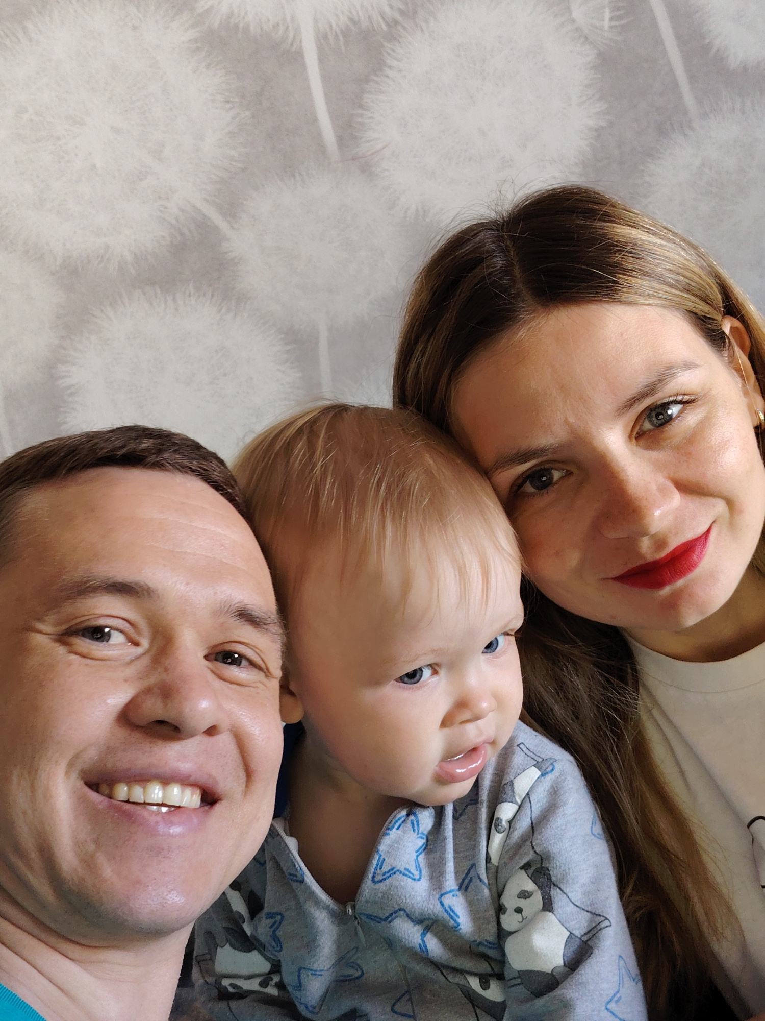 A close-up selfie captures a family of three: a man, a woman, and a baby, positioned closely together in a warm, intimate moment. The man is on the left, smiling broadly with white teeth visible. He h…read more