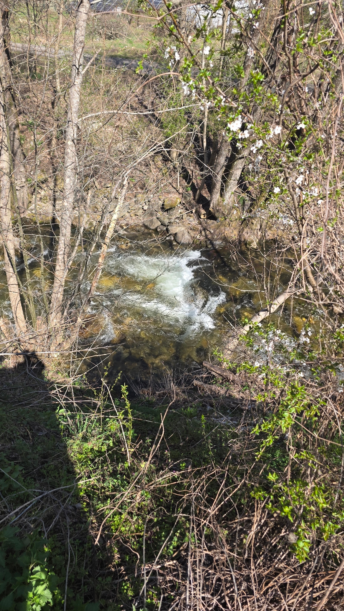 The image shows a small waterfall in a natural environment. The view is from above, looking down at a stream or river. The water appears to be flowing rapidly over rocks, creating a whitewater effect.…read more