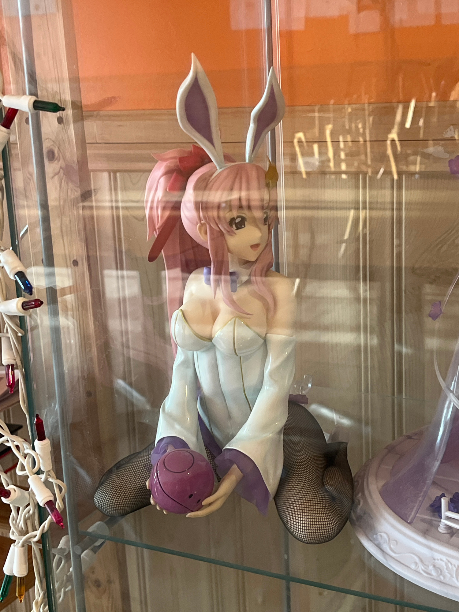A horizontal, close-up shot depicts an anime figurine displayed in a glass case. The figurine features a female character with pink hair, bunny ears, and fishnet stockings. She is wearing a white andβ¦read more