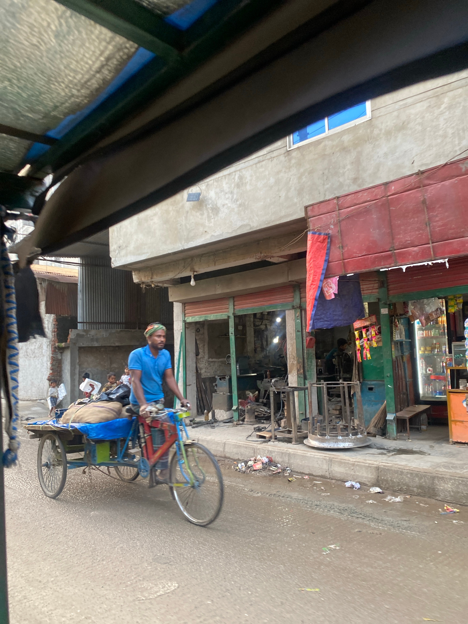 A street in Dhaka, Bangladesh, is depicted from the perspective of a rickshaw, revealing a man driving a cycle rickshaw. The man wears a blue shirt and a colorful head covering. He is pulling a ricksh…read more