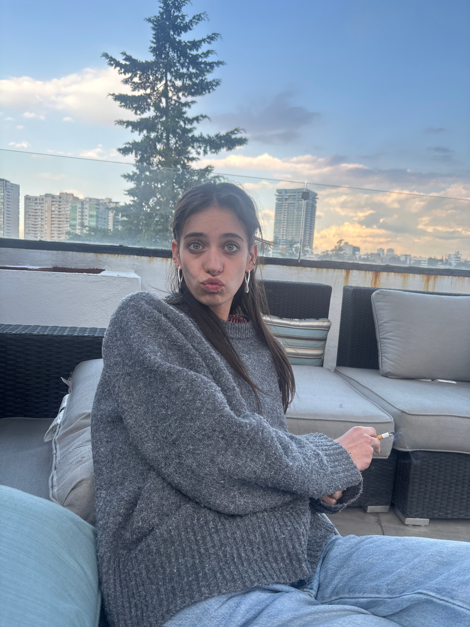 A young woman sits on a patio in Huixquilucan de Degollado, Mexico, holding a lit cigarette in her right hand. She wears a gray sweater and light blue jeans. Behind her is a view of the city skyline,…read more