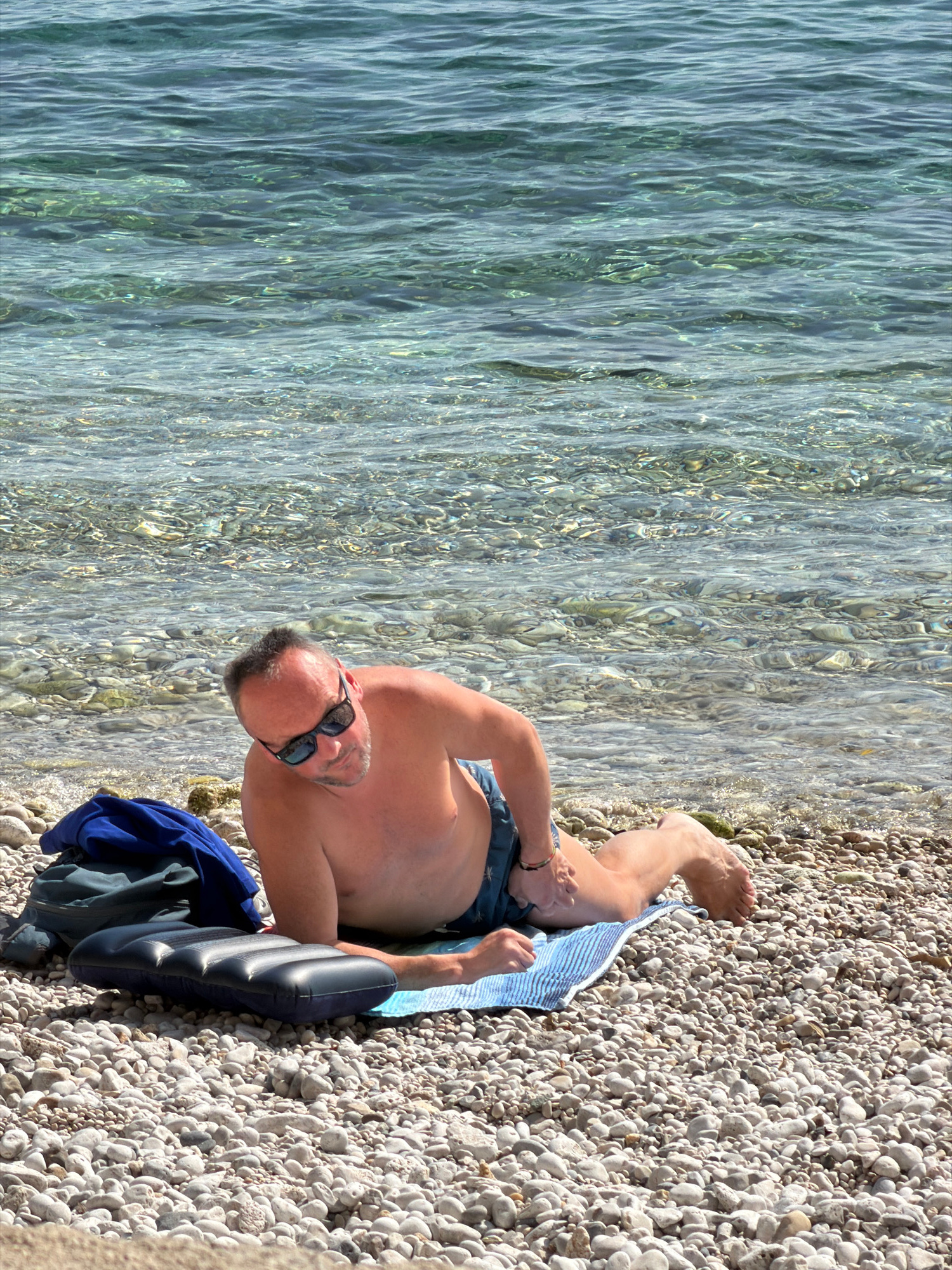 A man is depicted relaxing on a bright, sunny day at a pebble beach in Grad Rijeka, Croatia. He is lying on his right side, facing away from the viewer and towards the clear, calm turquoise water that…read more