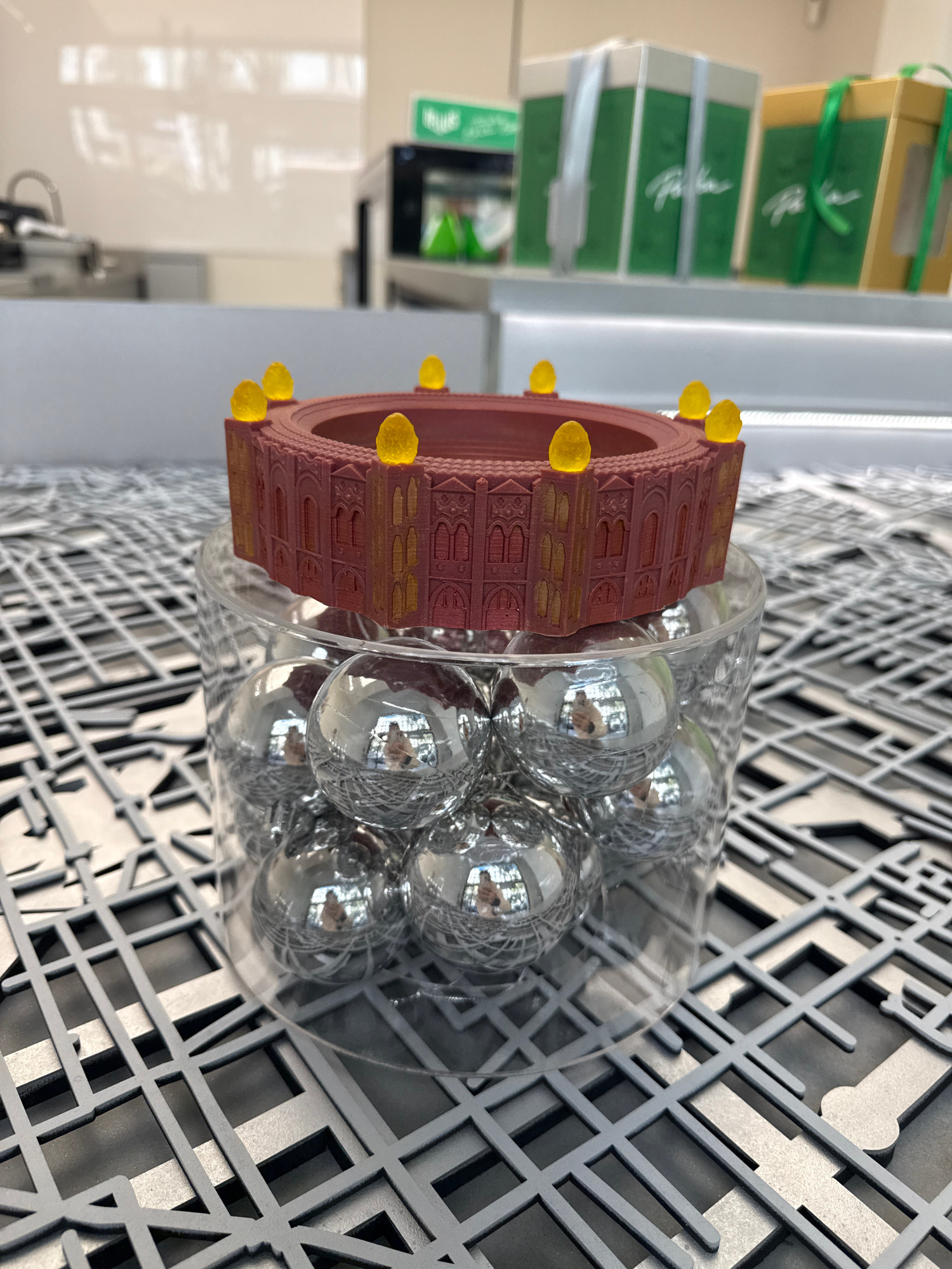 A close-up, indoor shot features an architectural model of the Sagrada Familia, filled with reflective silver baubles, set against a backdrop of a graphic black and grey wall pattern that appears to m…read more