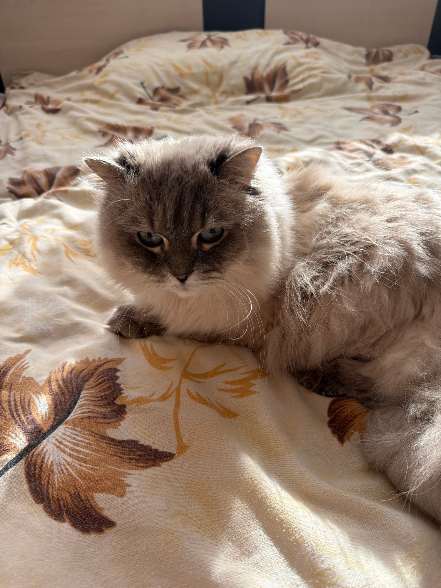 A long-haired cat with grey and white fur lies on a bed. The bed has a tan-colored sheet with brown floral patterns. The cat is facing the camera with its blue eyes. The image appears to be taken indo…read more