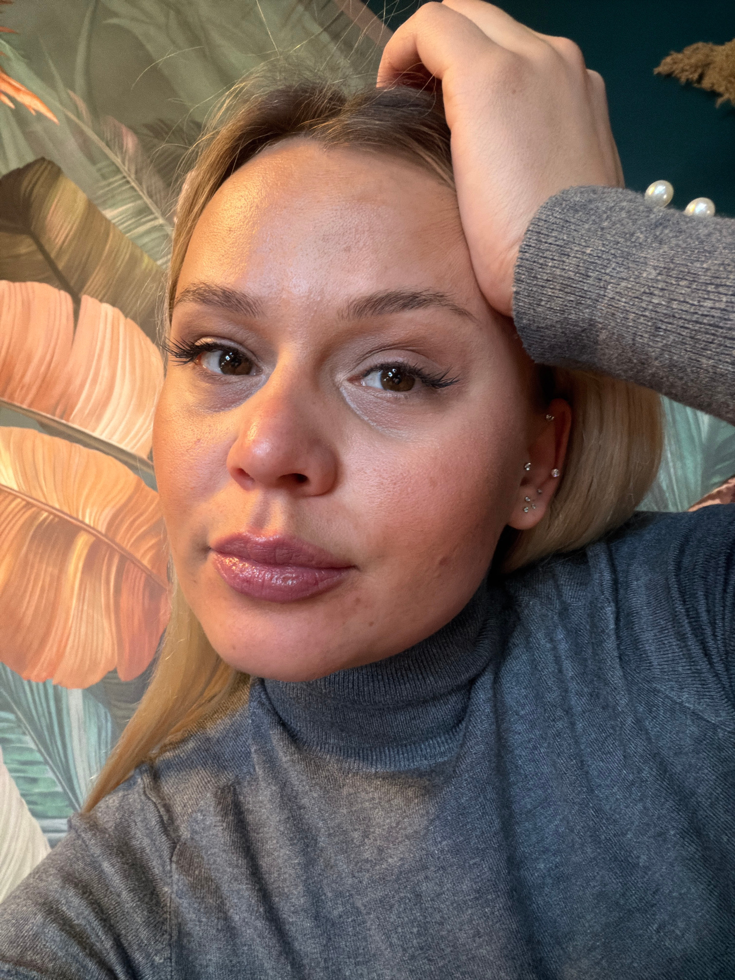 A woman with blonde hair is lying on a surface with a leaf pattern. She is wearing a grey turtleneck sweater with two pearl buttons on the sleeve. Her left hand is resting on her forehead. She has mul…read more