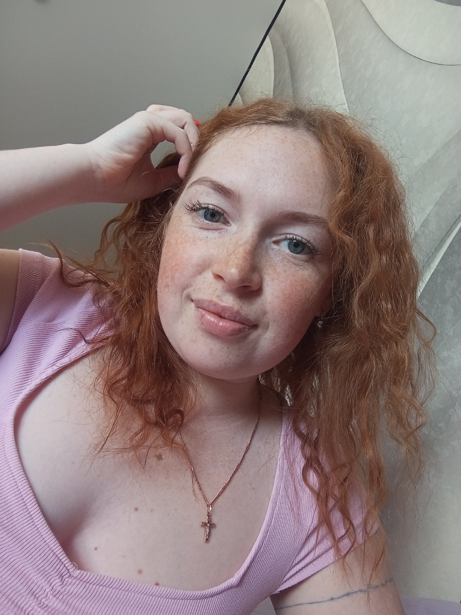 A fair-skinned woman with red, curly hair is positioned at an angle against a light-colored surface with a subtle, curved design. Her face is directed towards the camera, exhibiting freckles and blue…read more