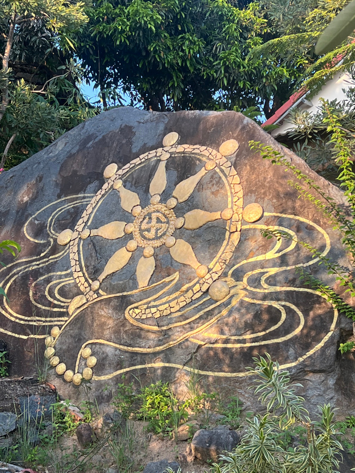 A large, dark grey rock, located in Nha Trang, Vietnam, is prominently featured, adorned with a gold-colored Buddhist Dharmachakra (Wheel of Dharma) emblem. The eight-spoked wheel is composed of gold-…read more