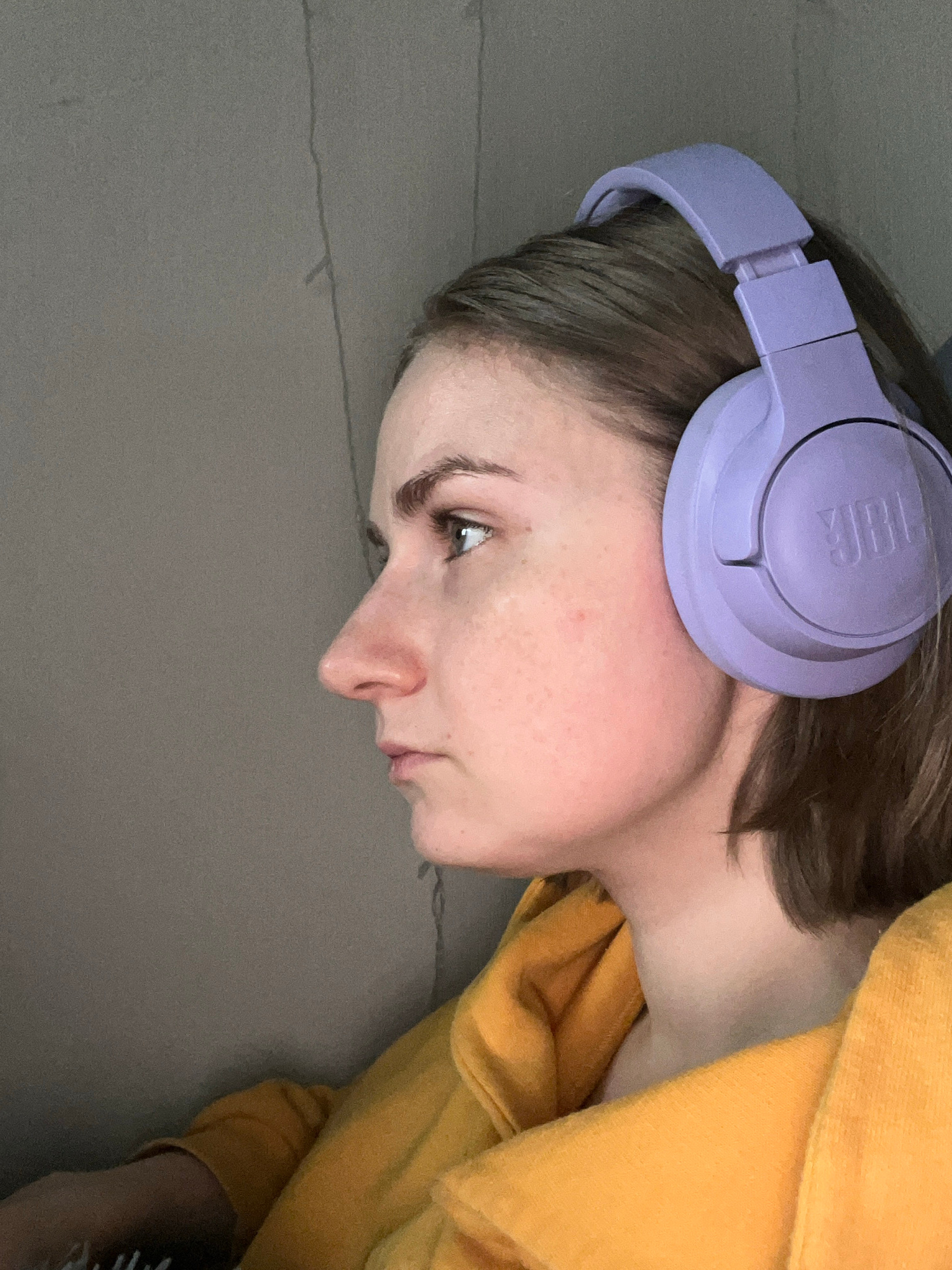 A close-up image shows a person lying on a gray surface, possibly a bed or couch. The person is wearing purple JBL headphones and a yellow hoodie. The location is not discernible from the image.