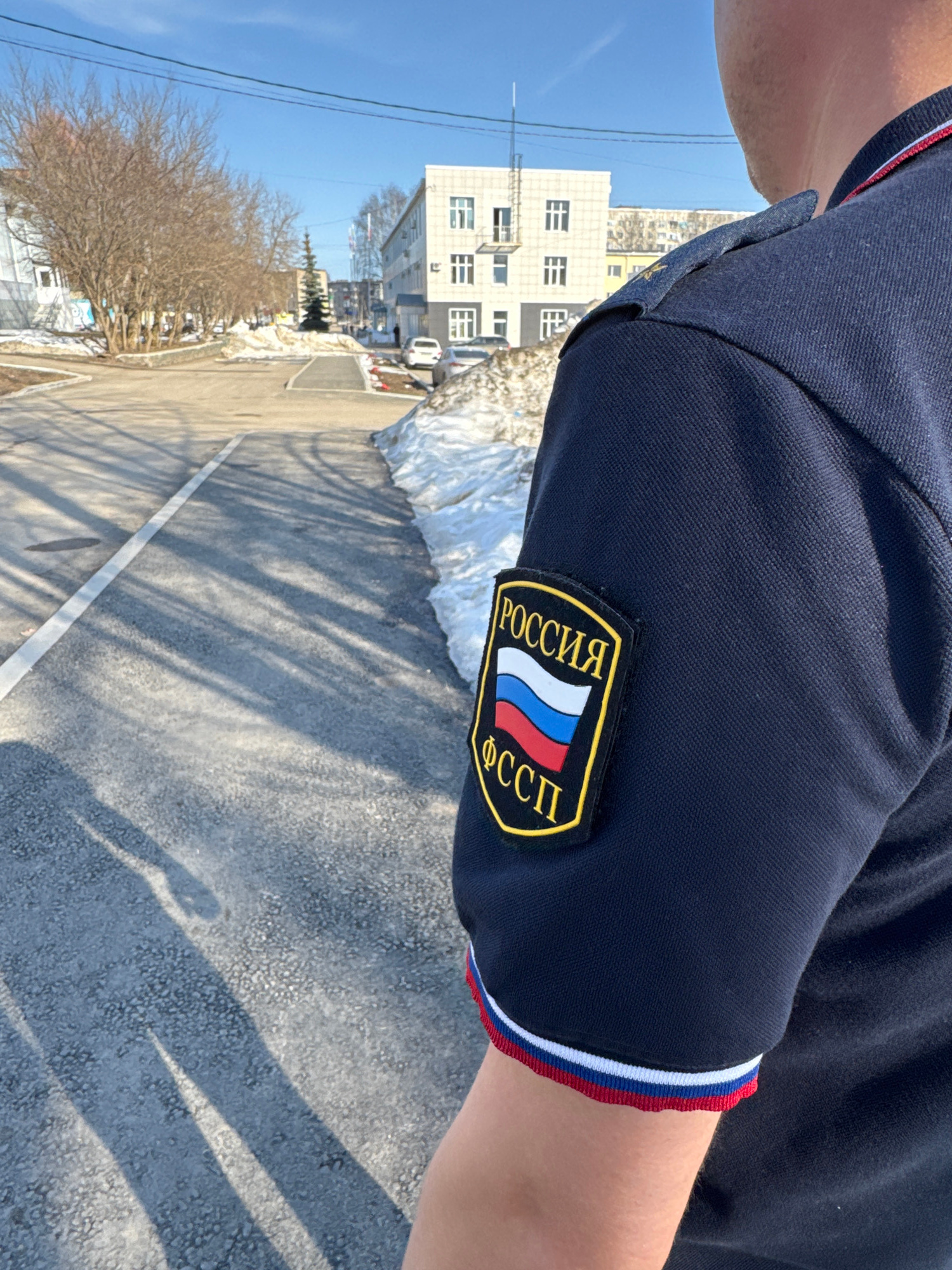 A close-up, slightly tilted shot depicts a person's upper arm, likely the left arm, wearing a dark blue polo shirt with red, white, and blue trim on the sleeve. Affixed to the sleeve is a patch with t…read more
