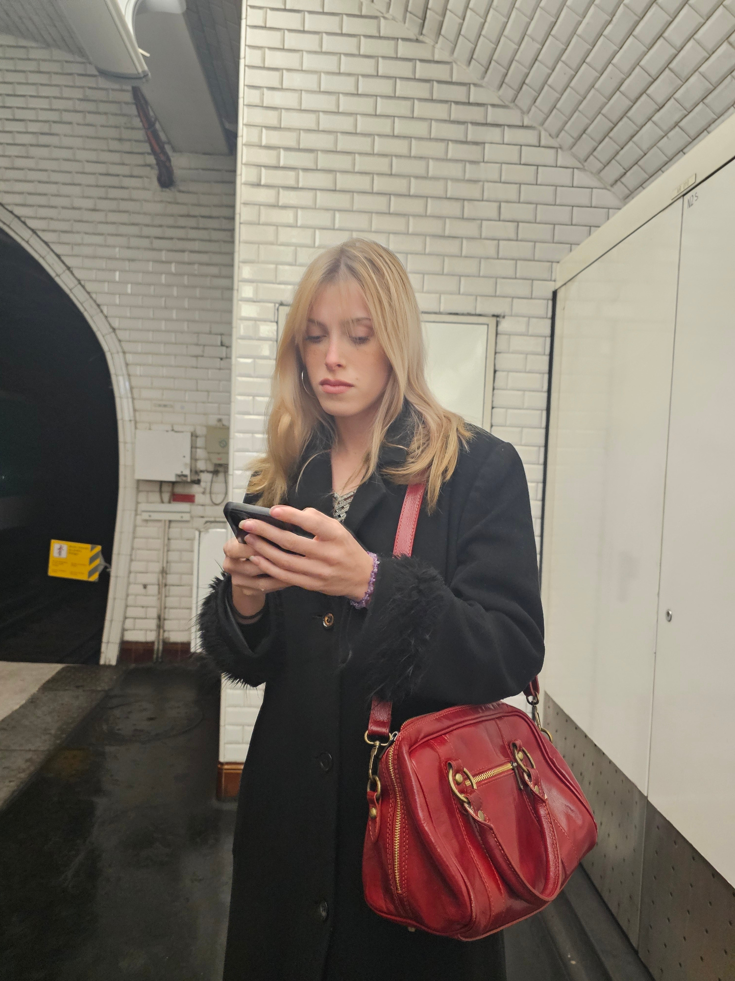 A woman with blonde hair wearing a black coat and carrying a red handbag is standing in a subway station. She is looking at a mobile phone she is holding in her hands. The subway station has white til…read more