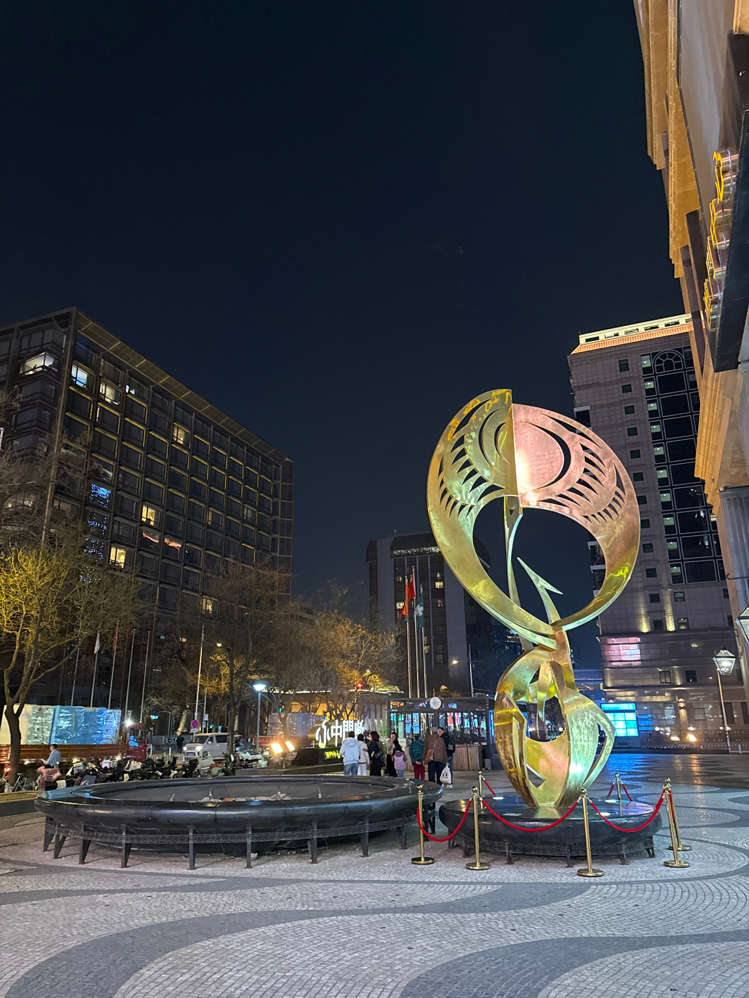 This nighttime photograph shows a large, golden metal sculpture in the foreground of a city square, likely in Dongcheng District, China. The sculpture appears to be abstract, possibly depicting styliz…read more