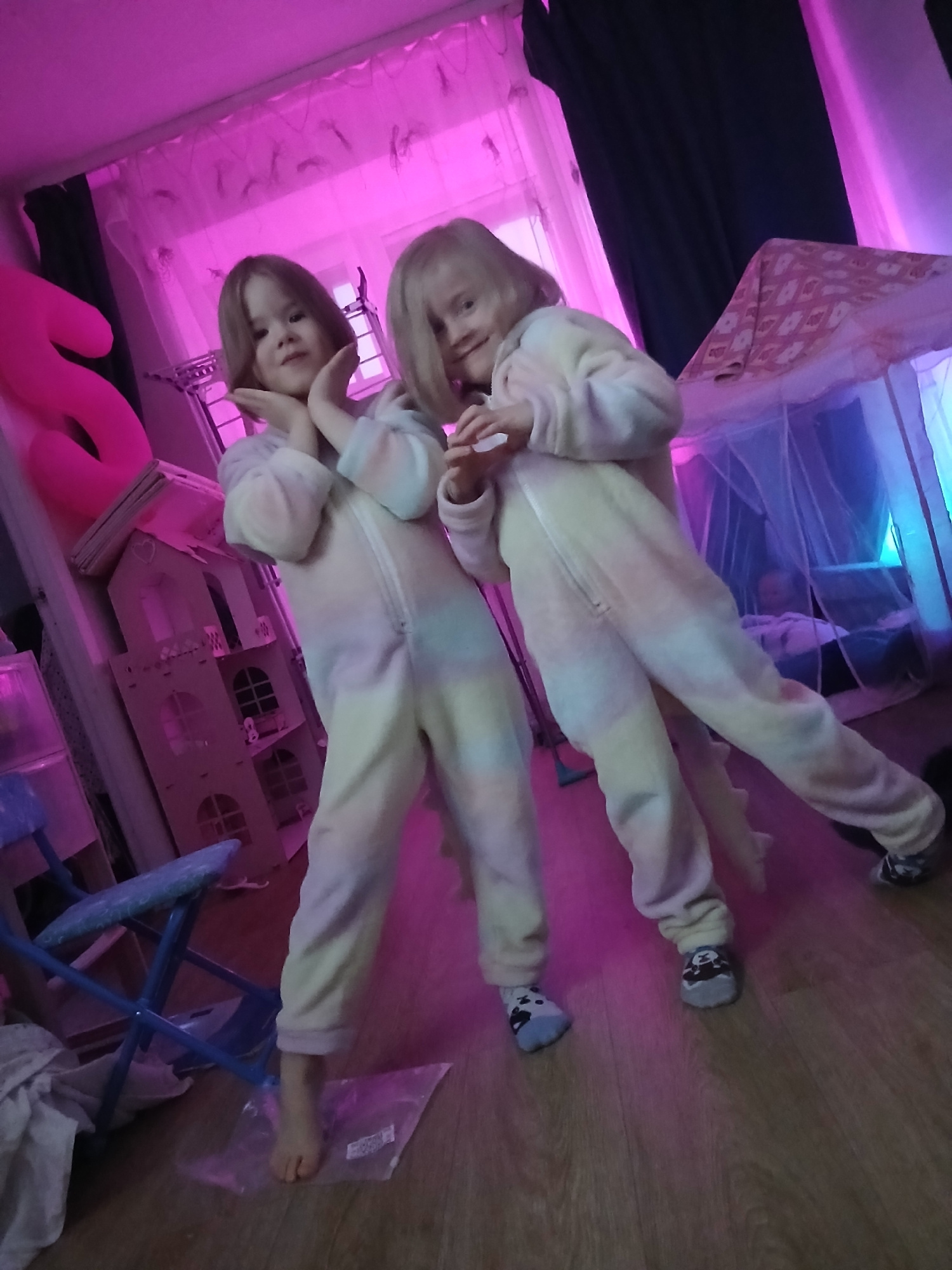 Two children, one with blonde hair and the other with brown hair, lie on a wooden floor, both wearing pale-colored animal-themed onesies. They are indoors, near a pink inflatable object and a dollhous…read more