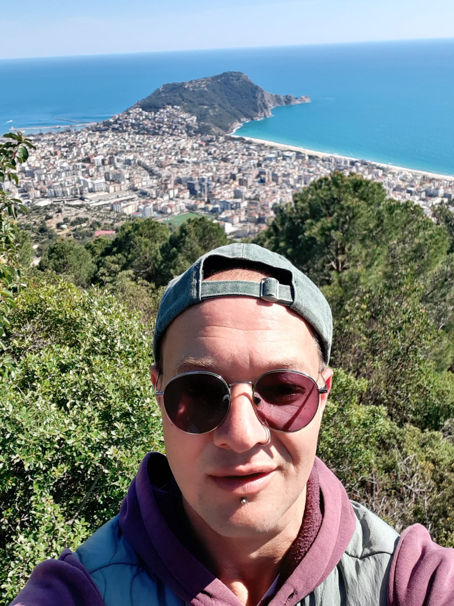 The image shows a person wearing sunglasses, a cap, and a hooded sweatshirt, with a visible lip piercing. The background features a cityscape by the sea. The city is Alanya, Turkey. The perspective is…read more