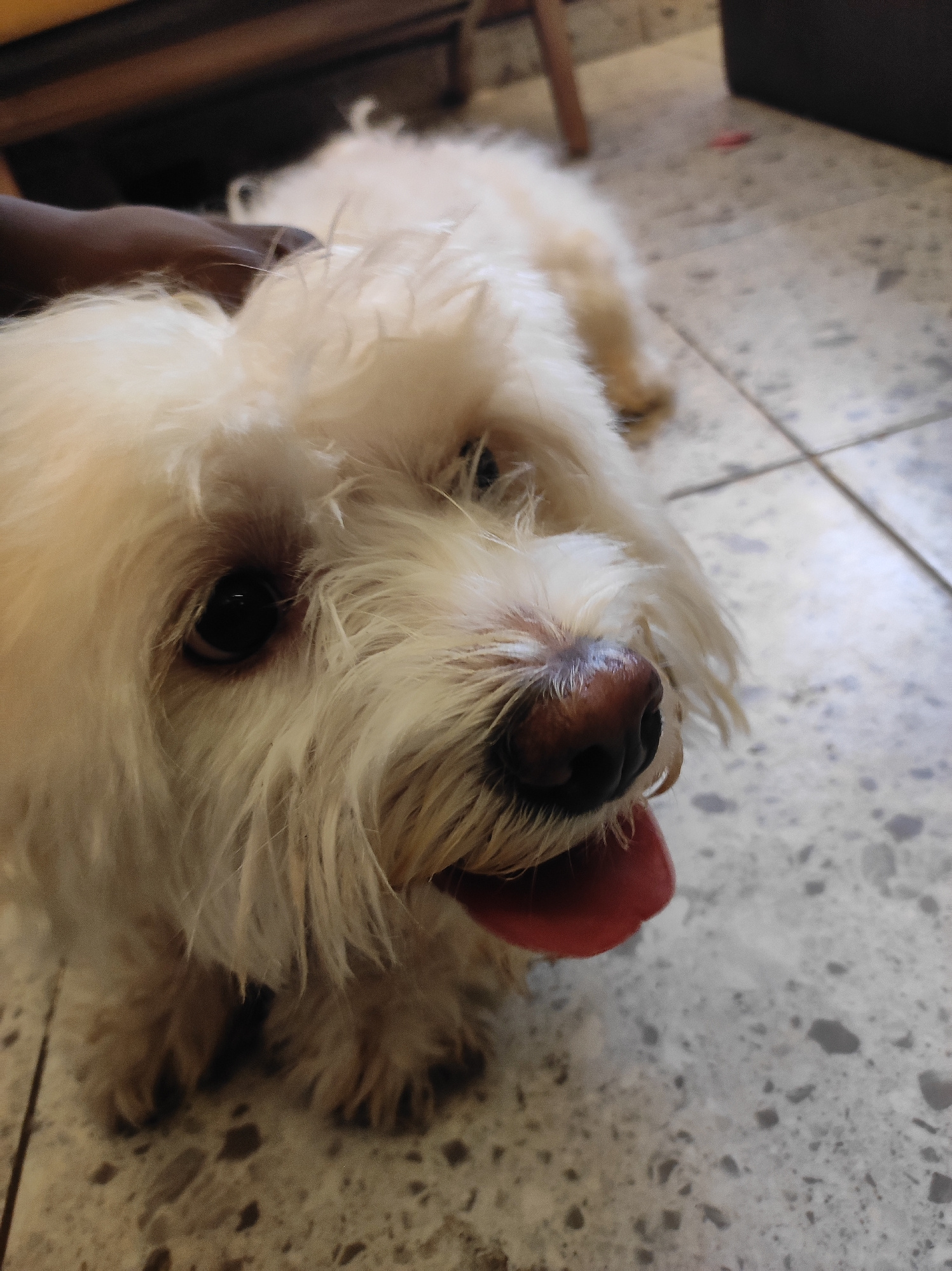 A close-up shot features a small, white dog with long, fluffy fur. The dog is lying down on a tiled floor, with a dark-skinned hand resting on its head. Its tongue is sticking out, suggesting it might…read more
