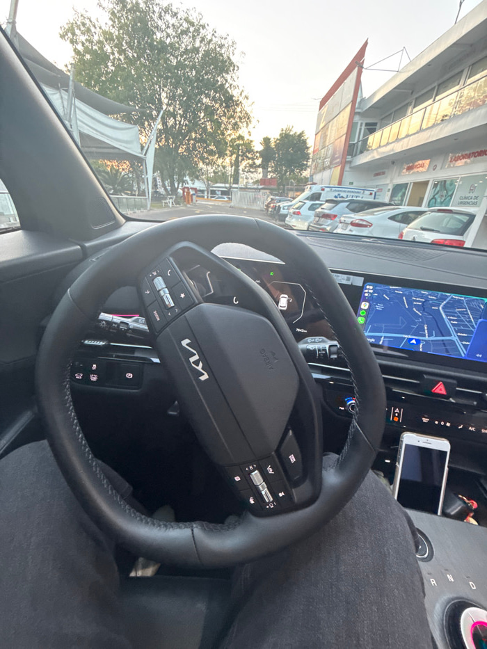 Captured from the driver's seat, a Kia steering wheel dominates the frame with the brand logo prominently displayed. Outside the car, a building with a red-roofed awning and several parked white vehic…read more