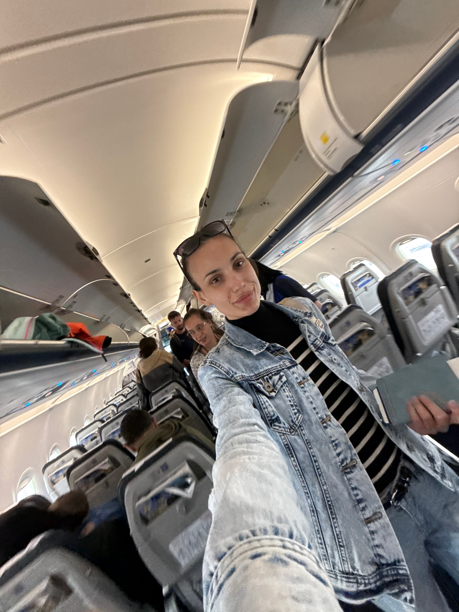 The image is an angled, downward-facing view of an airplane cabin. The photographer is a woman wearing a denim jacket over a black and white striped top and jeans; she has sunglasses on her head. Othe…read more