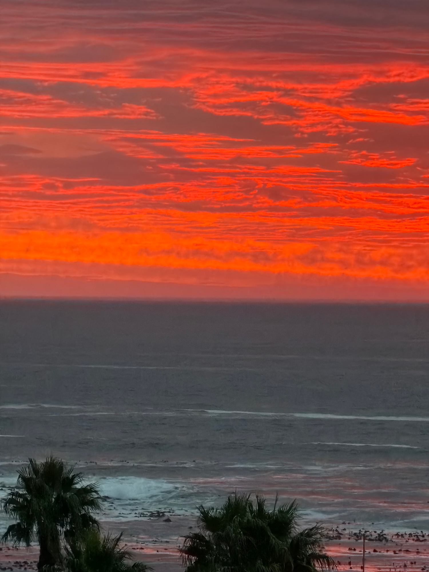 The image depicts a beach scene at sunset, possibly in Cape Town, South Africa, given the palm trees and overall aesthetic. The left side of the image is dominated by a fiery orange and red sunset, wi…read more