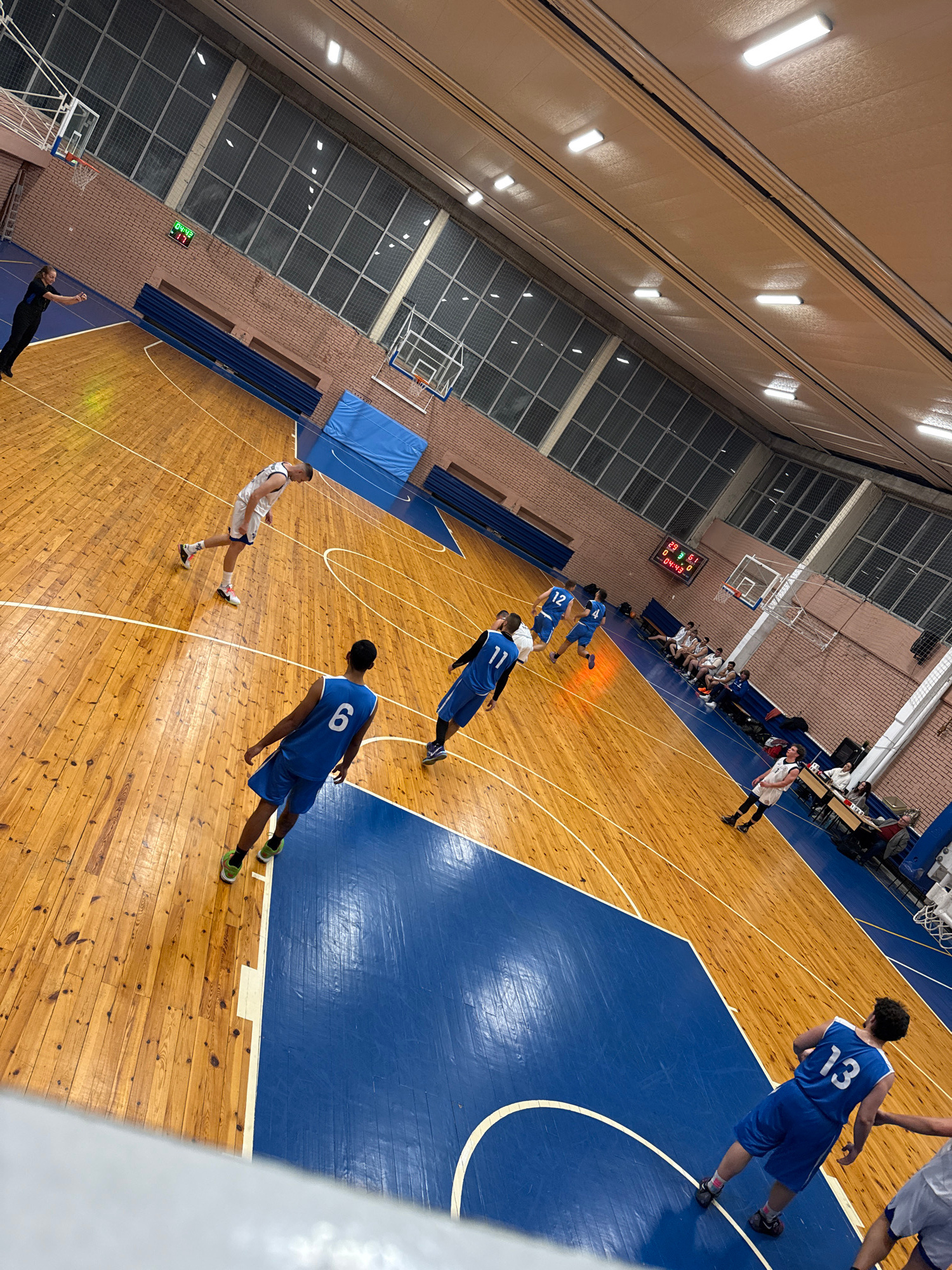 The image depicts a basketball game in progress inside a gymnasium. The court has a wood floor with blue-painted zones. Several players are visible, wearing blue and white uniforms. One player, wearinβ¦read more