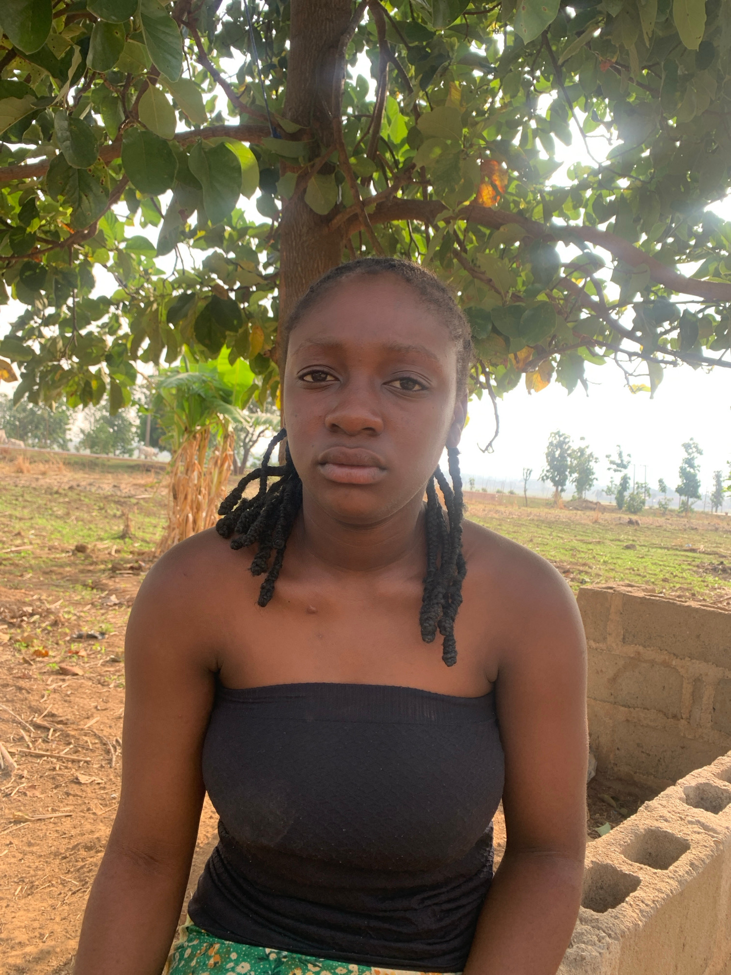 A young woman with dark skin and braided hair looks directly at the camera, posing for a photograph. She is wearing a black strapless top, with her right arm visible at her side. Her expression is neu…read more
