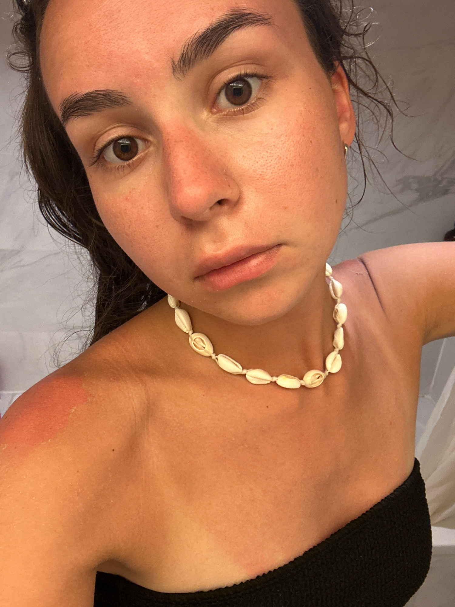 A close-up, angled view focuses on a woman. She wears a cowrie shell necklace and a black top. Her skin shows signs of sun exposure, particularly on her shoulder. The background is a blurry white, pos…read more