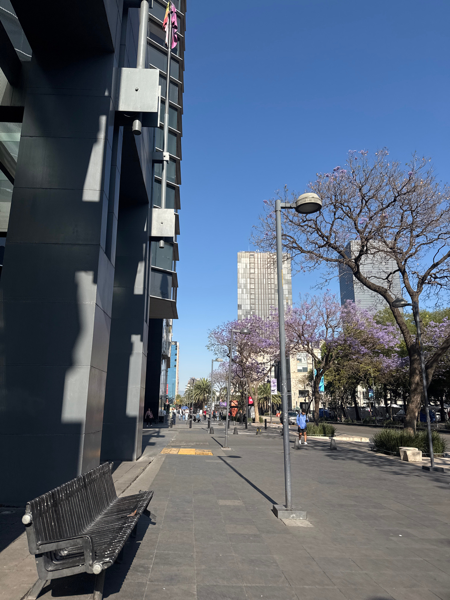 The image depicts a street scene in Mexico City, Mexico. A gray building occupies the lower left of the frame, with a sidewalk extending to the right. A black metal bench sits on the sidewalk next to…read more