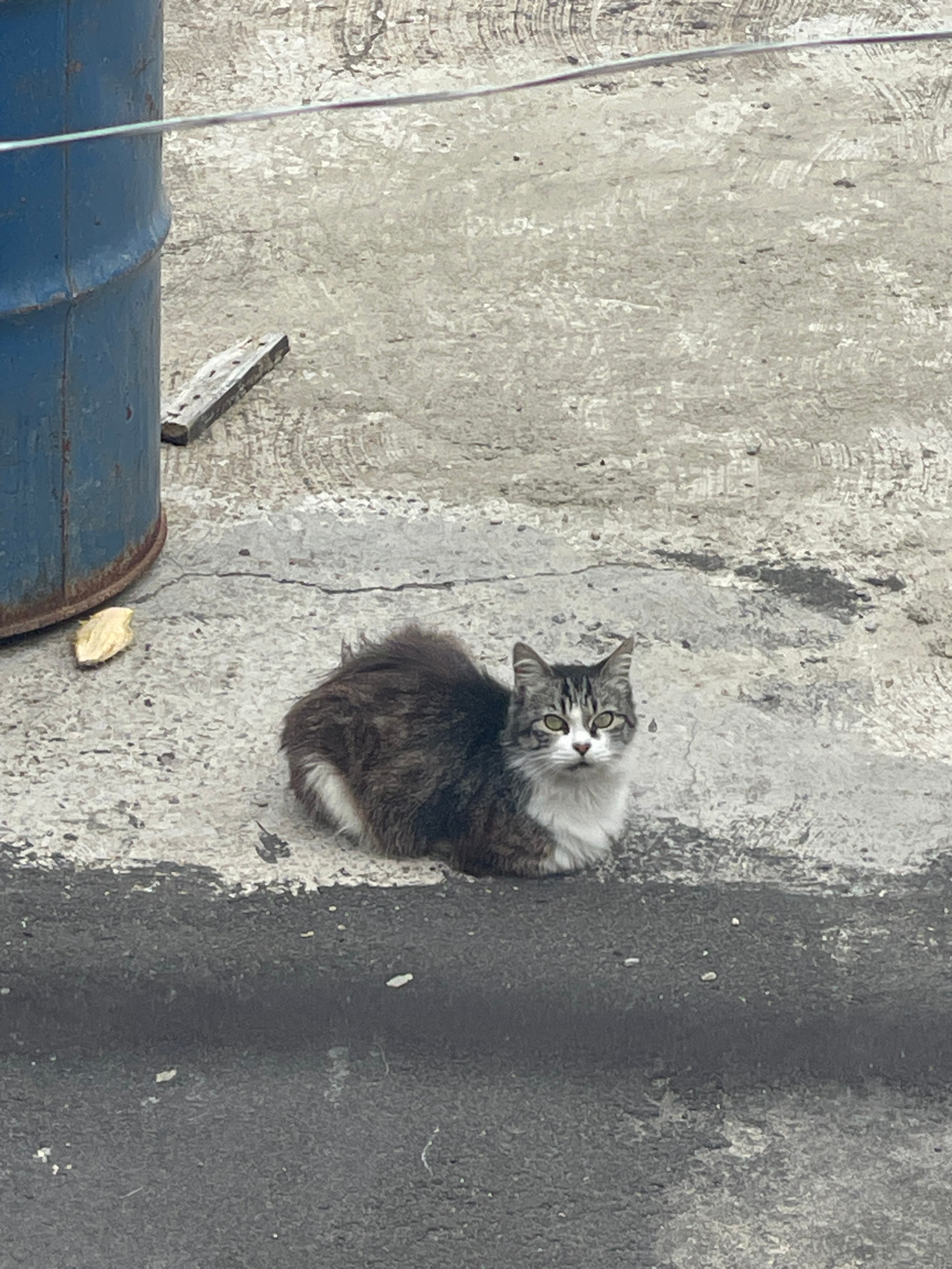 The image shows a cat sitting on a concrete surface in an urban environment. The cat has grey tabby markings and white fur on its chest. A blue barrel is visible in the lower left corner of the image.…read more