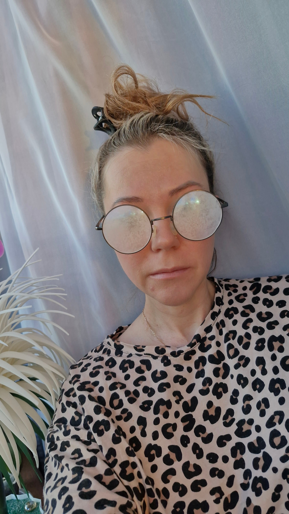 A fair-skinned person wearing round, wire-rimmed glasses is lying down on a surface of light blue fabric. The person has light blonde hair that is styled in a messy bun, held in place by a black claw…read more