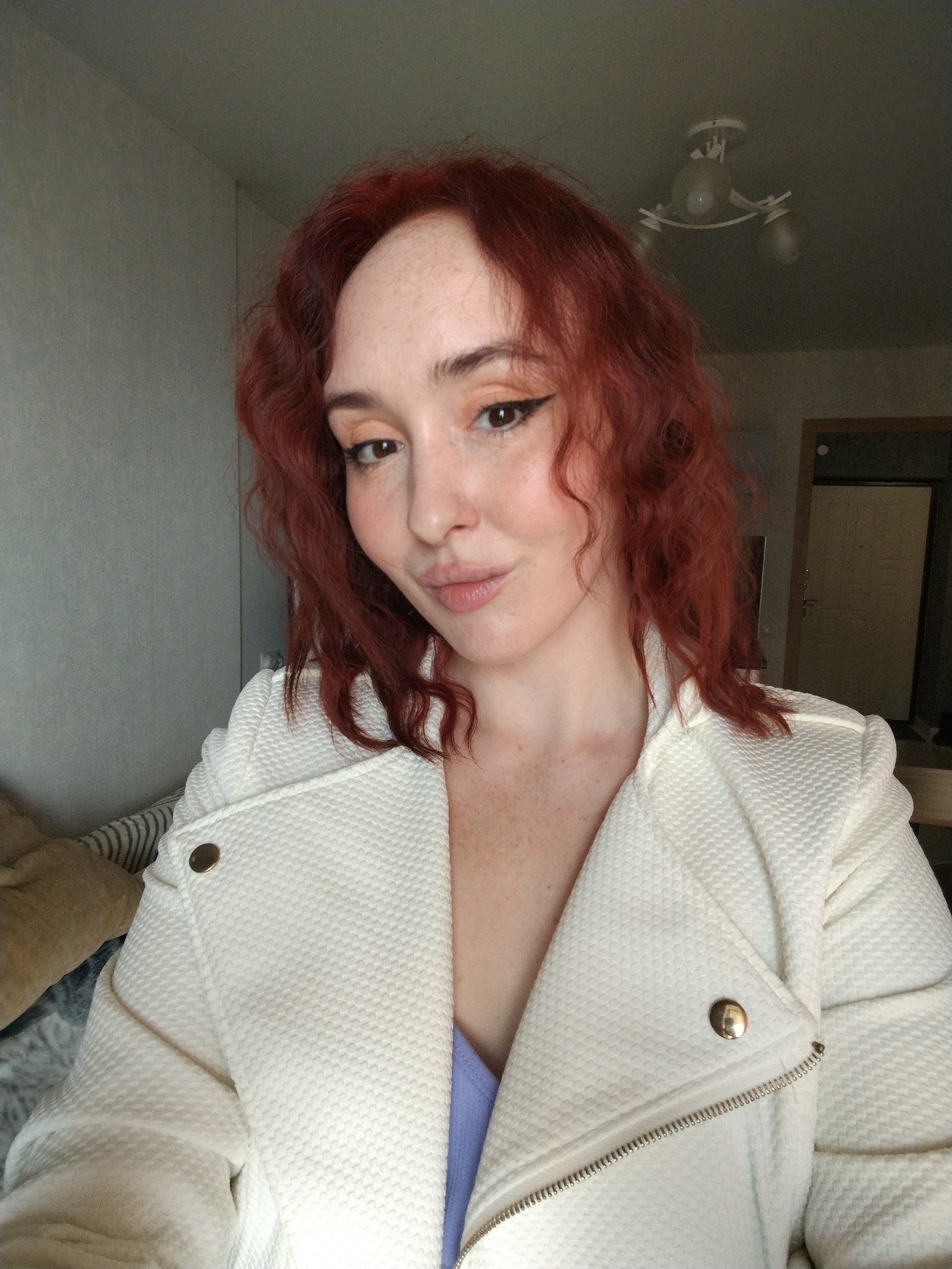 A woman with red curly hair and fair skin is posing for a selfie indoors. She is wearing a white textured jacket with gold buttons and a light purple top beneath. Her makeup includes winged eyeliner a…read more