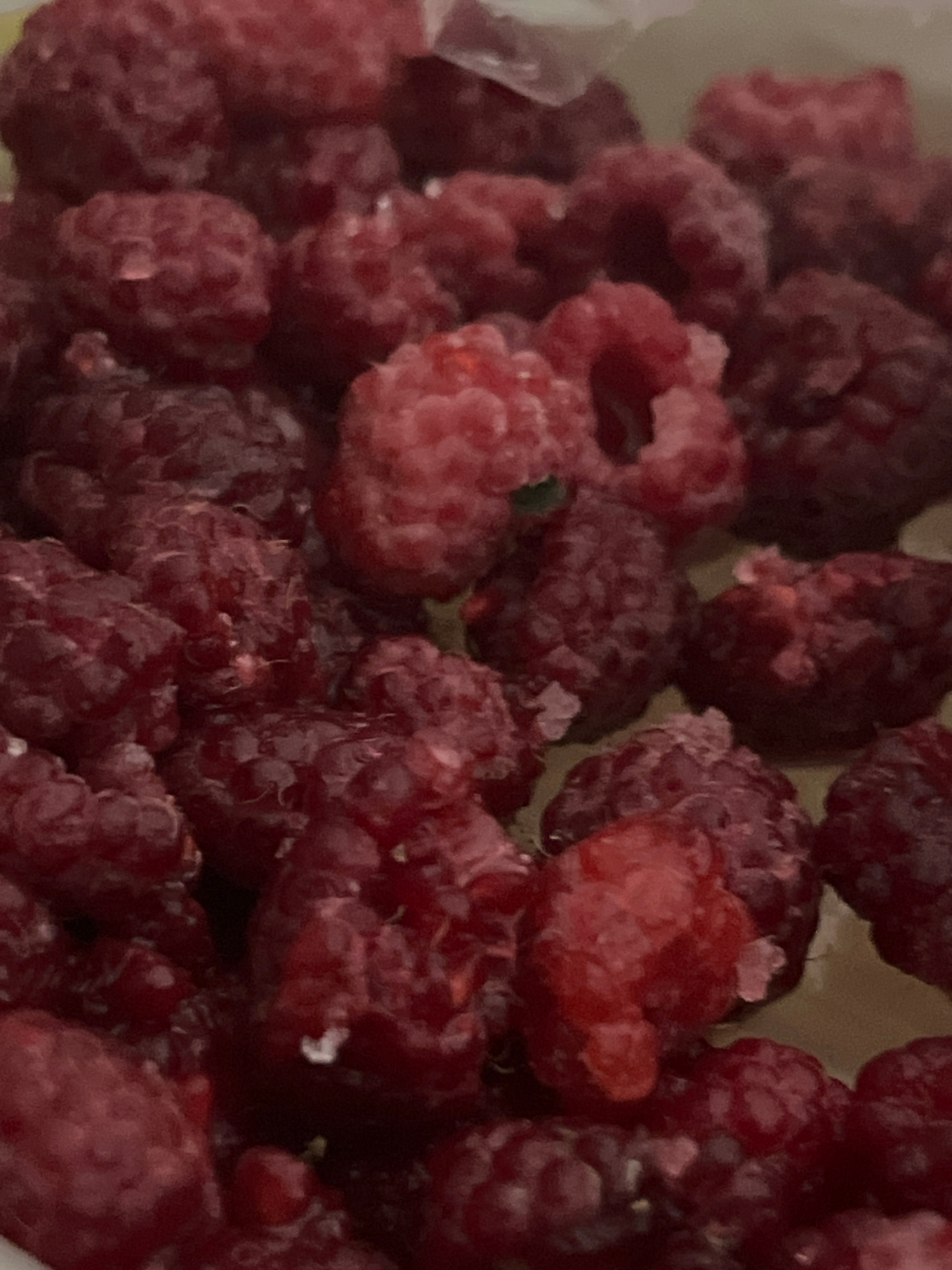 The image presents a close-up, top-down view of numerous raspberries, filling the majority of the frame. The raspberries exhibit a range of colors, from bright red to a deeper, darker purplish-red. Ma…read more