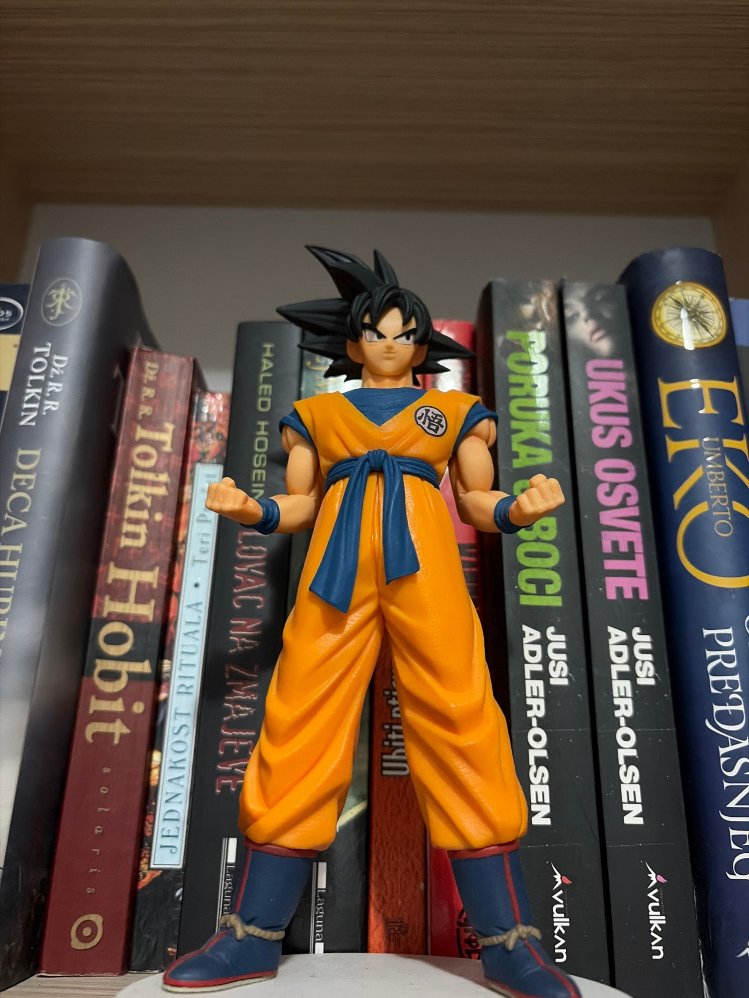 A Goku action figure from Dragon Ball is playfully displayed horizontally against a stack of books, creating the illusion of flight or levitation. The figure, dressed in its iconic orange gi with blue…read more