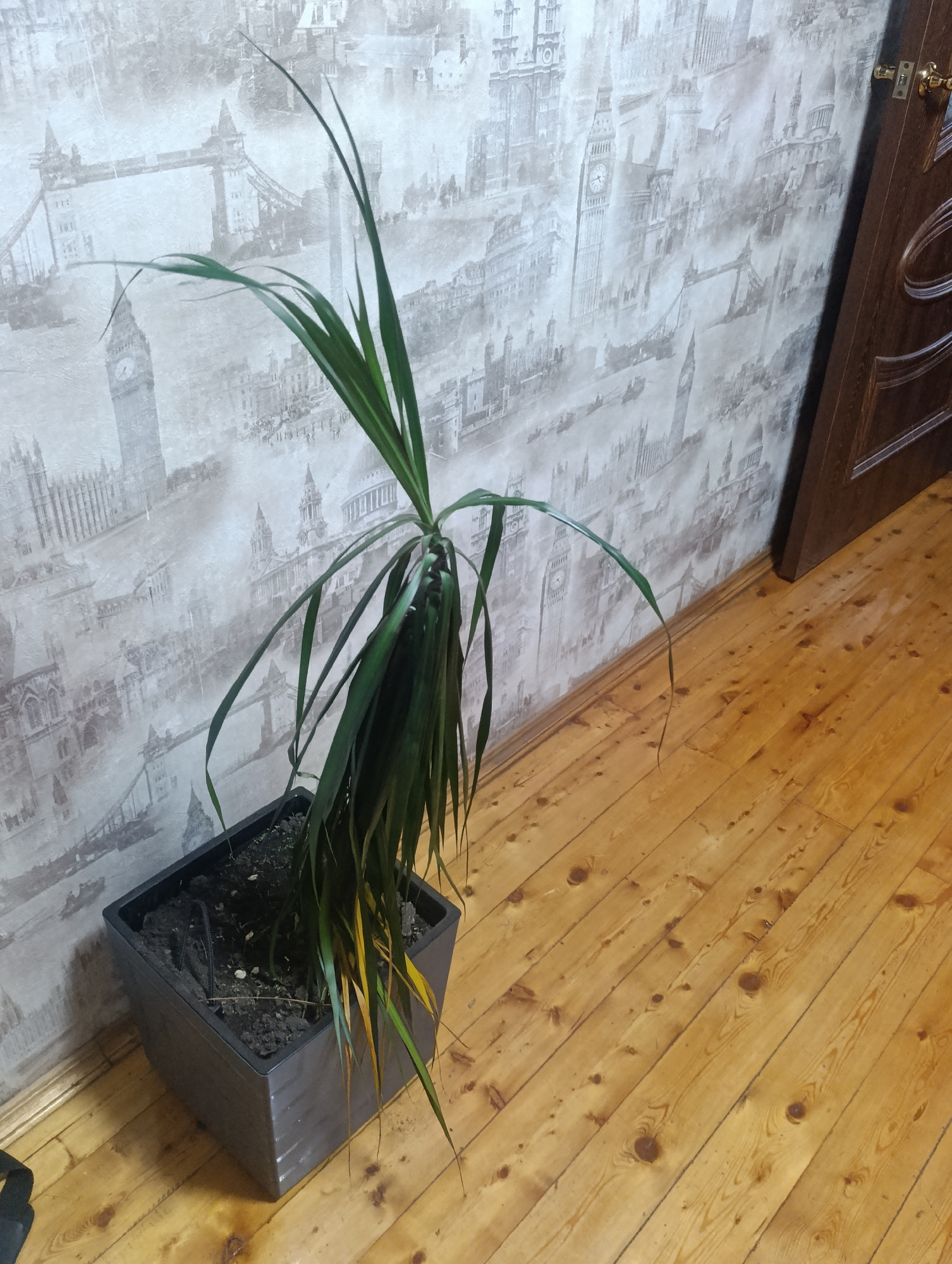 An indoor scene in Krasnoyarsk, Russia, features a potted plant positioned against a wall with wallpaper and beside a wooden door. The primary subject is a tall, slender plant, possibly a dracaena, wi…read more