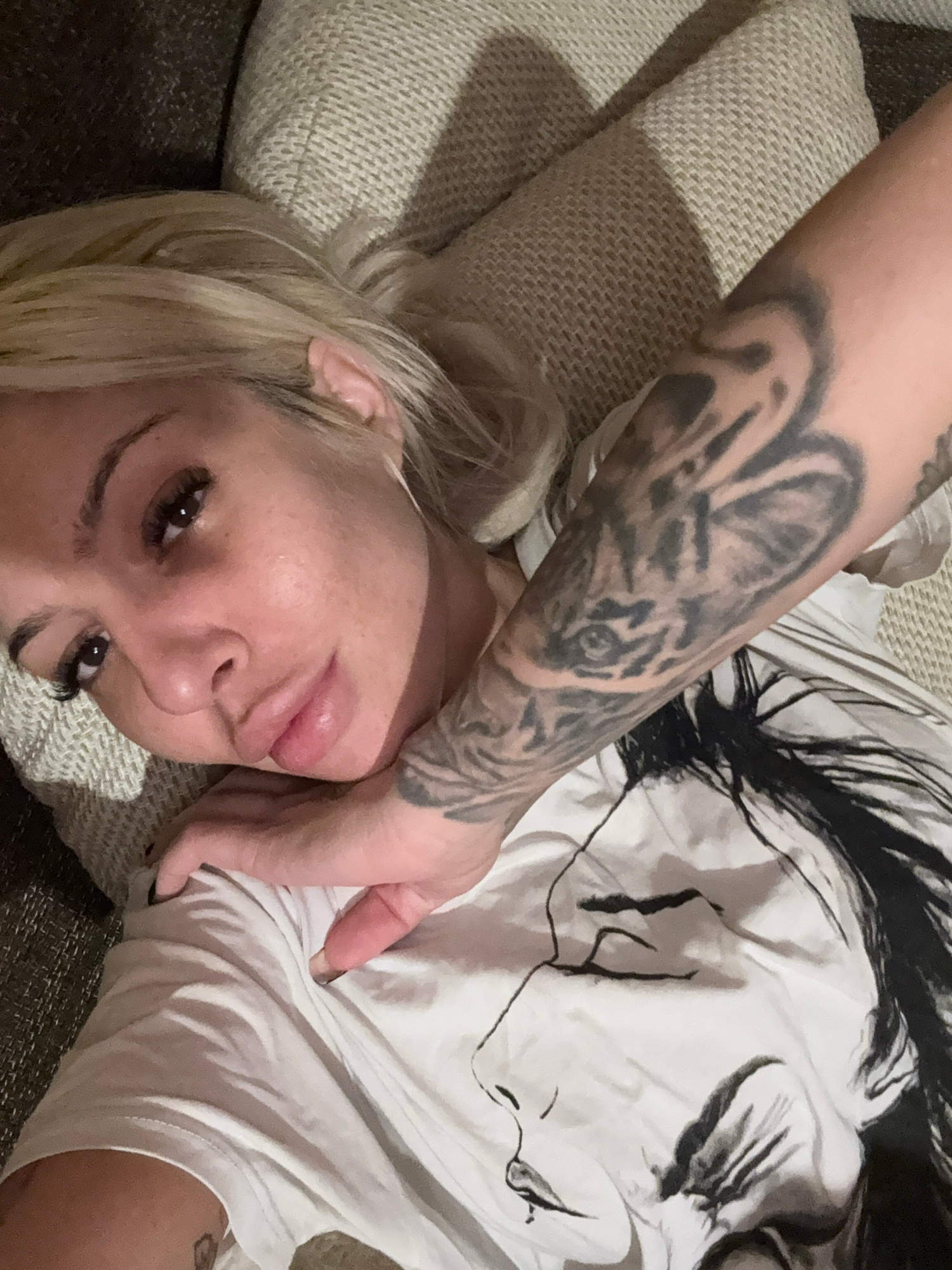 A young woman with blonde hair is seen from an overhead perspective, lying on her back on a textured, light-colored pillow or blanket, which rests on a darker sofa or piece of furniture. Her head is t…read more