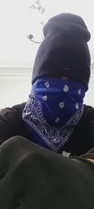 A person wearing a black ski mask and a blue bandana with a white paisley print obscures most of their face. Only a small part of their skin is visible. They are also wearing a black jacket. In the ba…read more