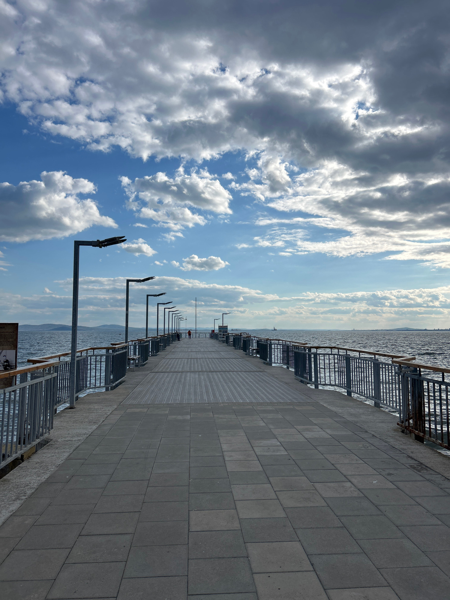 The image displays a long, straight pier extending into a large body of water under a partly cloudy sky. The pier is constructed with light grey rectangular paving tiles for the walking surface, borde…read more