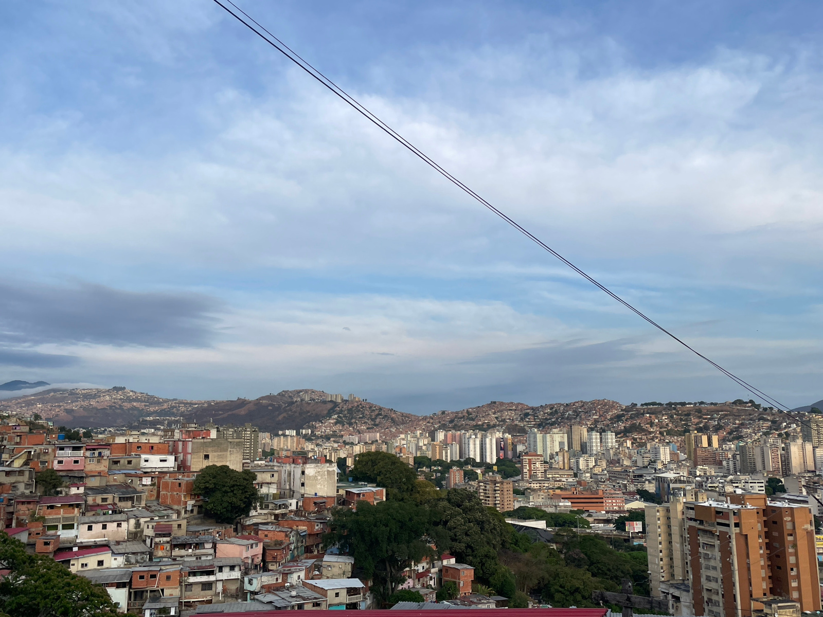 The image shows an upside-down view of Caracas, Venezuela. In the foreground, there is a blue sky with clouds and a power line. In the middle ground, there is a city with a mix of high-rise buildings,…read more