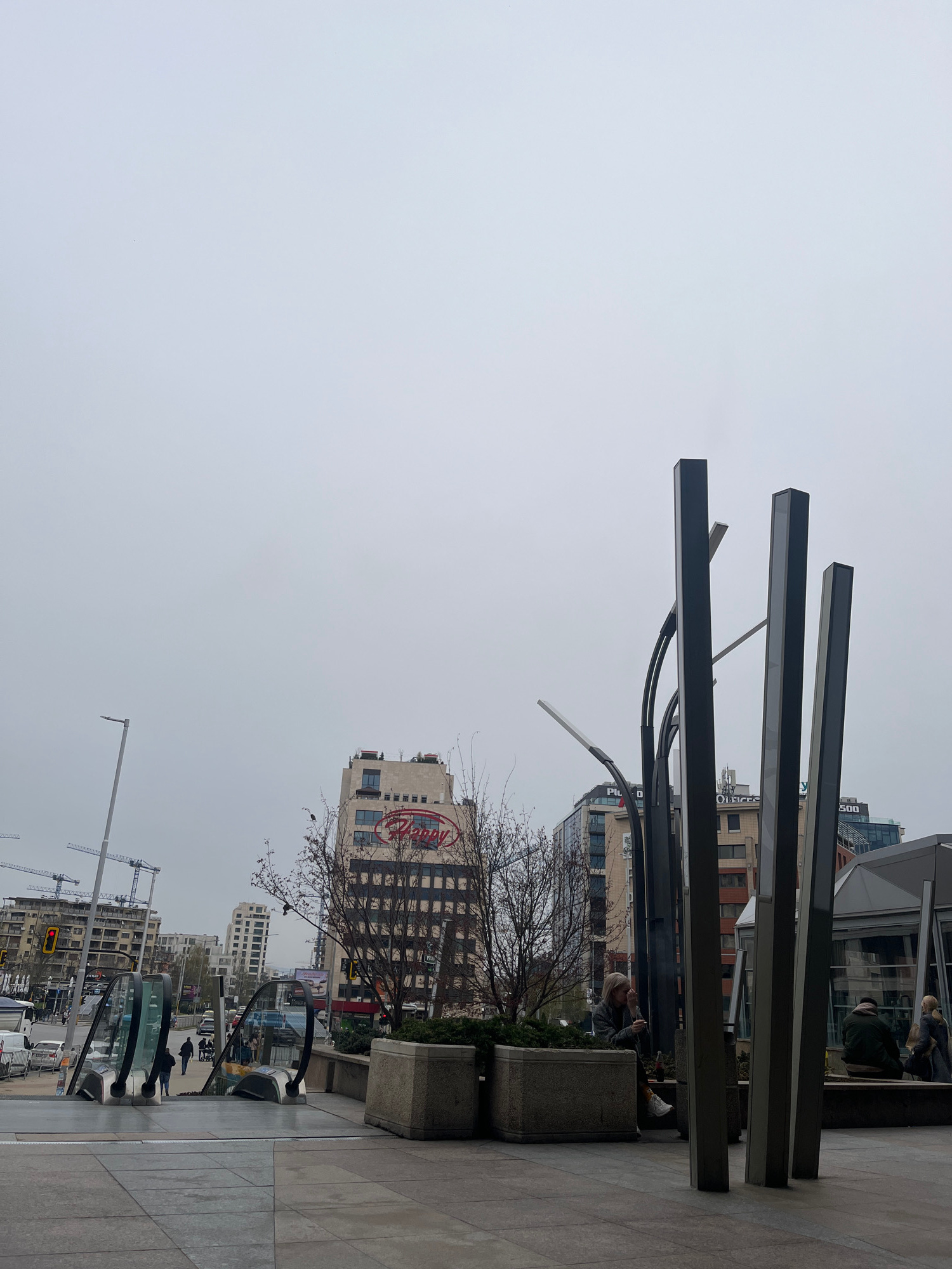 The image depicts an urban landscape in Sofia, Bulgaria, on an overcast day. In the foreground, there are modern metal structures with dark, rectangular beams and curved supports. People are sitting o…read more